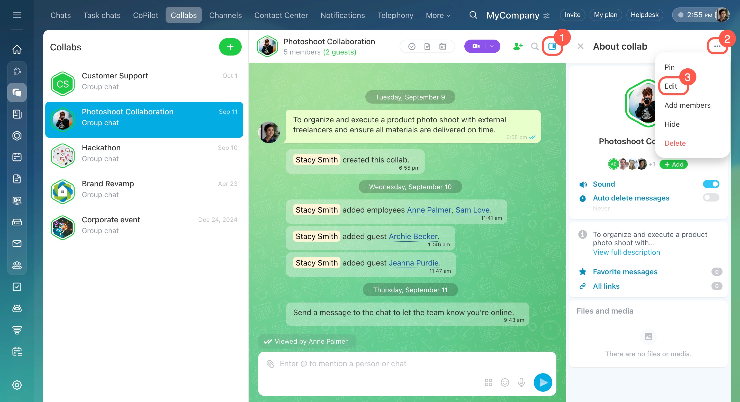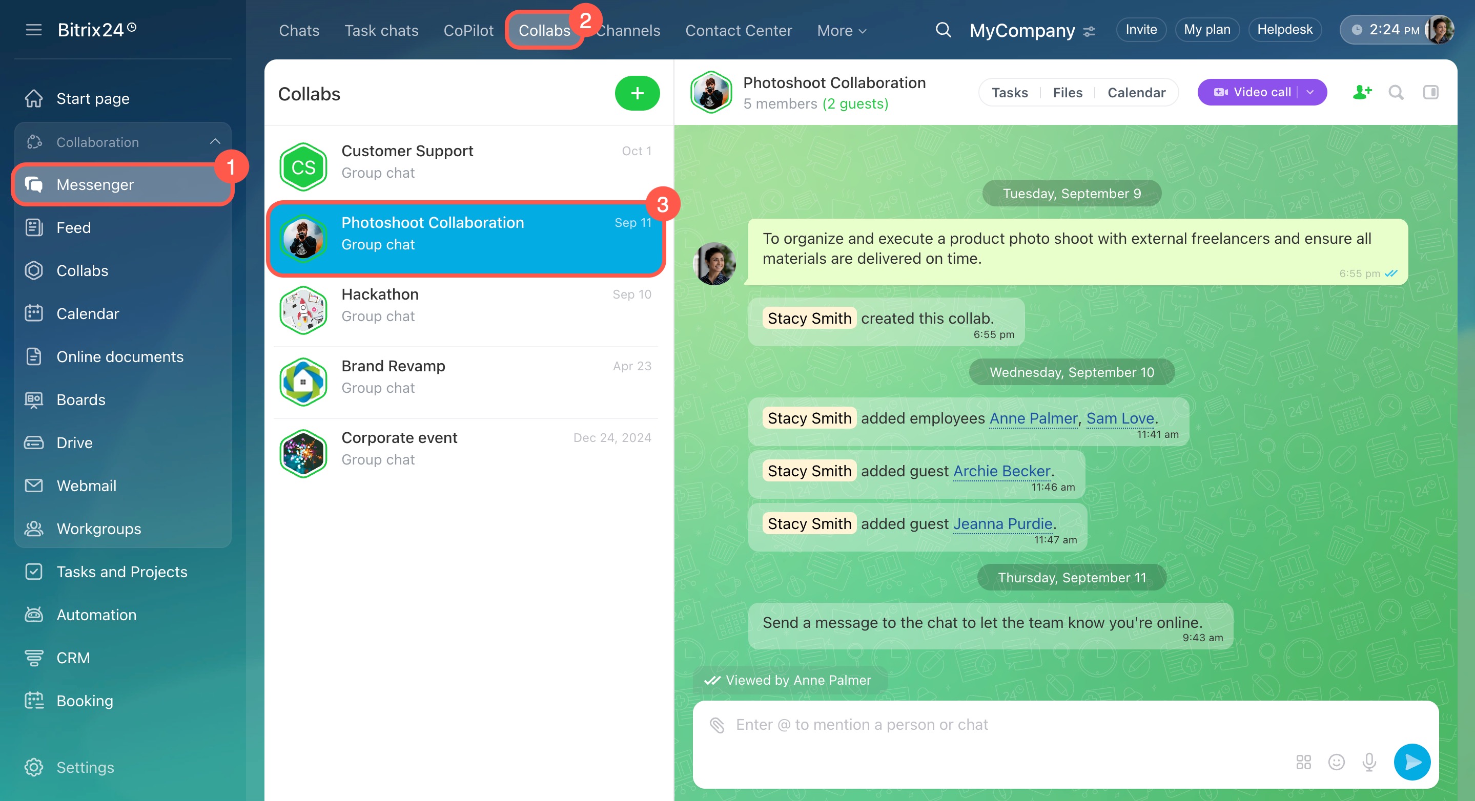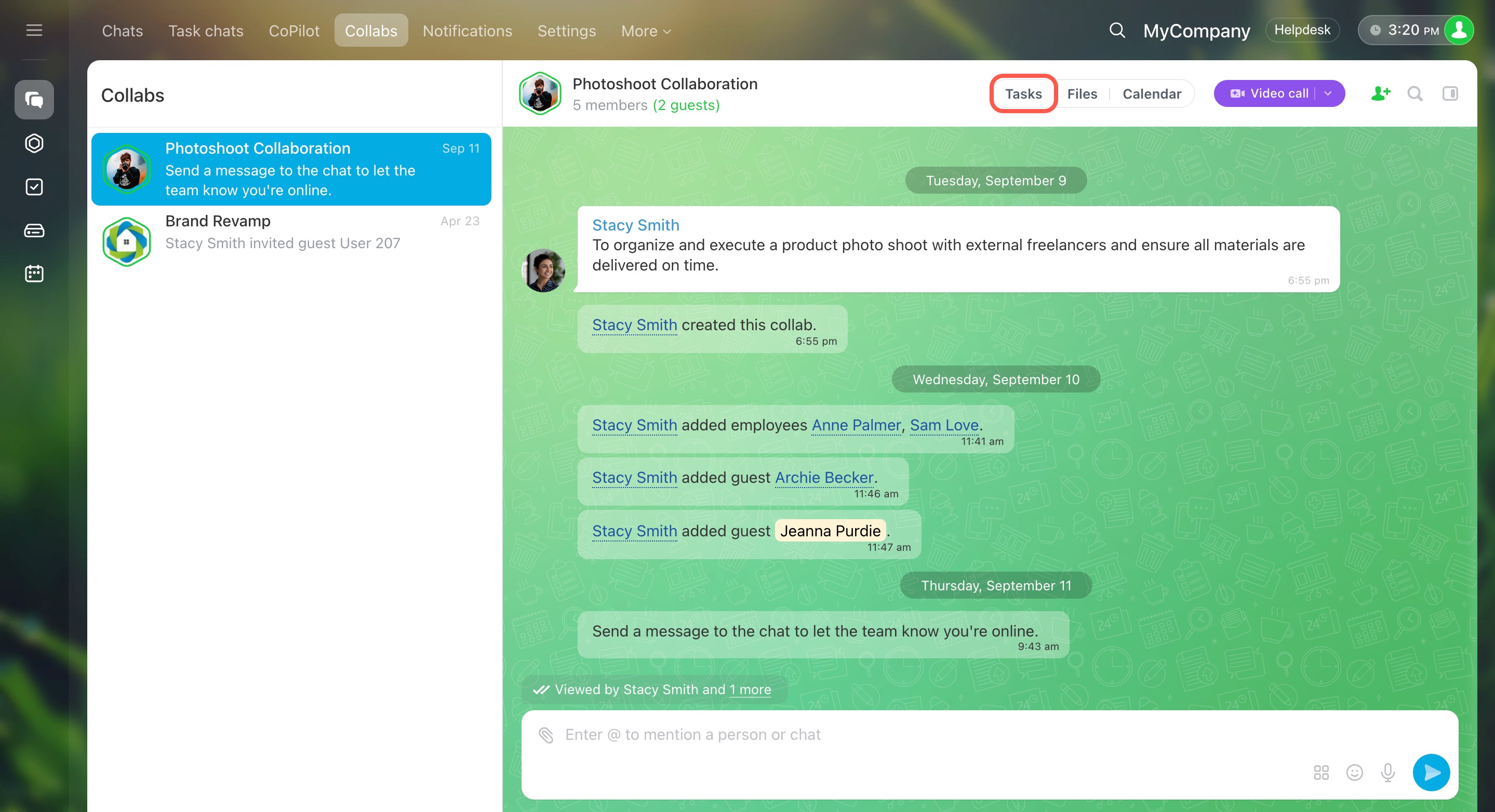 Une collab est un espace de collaboration avec des clients et des équipes externes. Discutez dans le chat, invitez des participants à des événements, travaillez avec des fichiers et attribuez des tâches. Les tâches dans les collabs aident à passer rapidement des accords aux actions concrètes. Les participants verront toutes les tâches de la collab, même s'ils n'y participent pas.