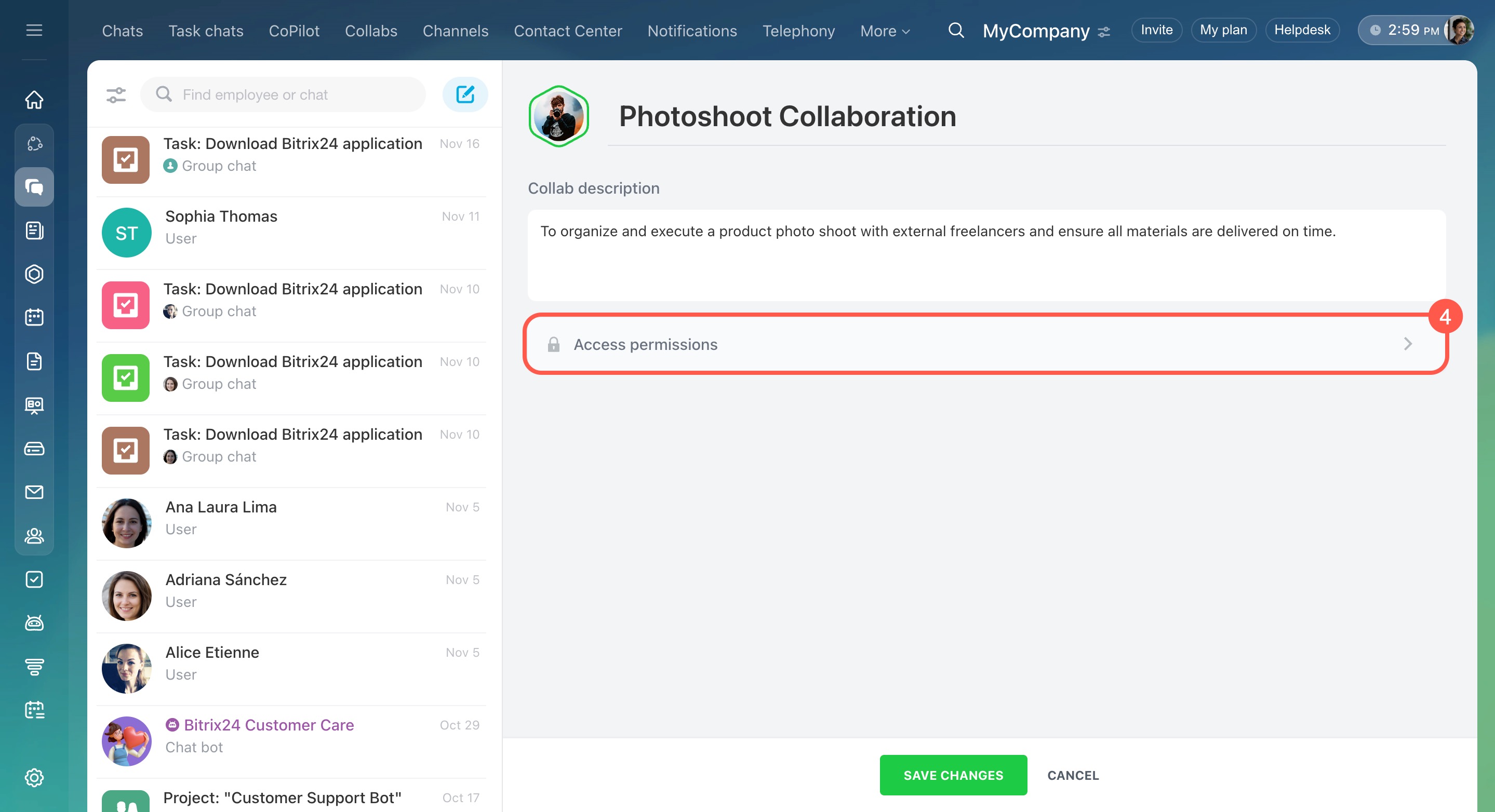 Indiquez qui peut voir, modifier et supprimer les tâches de la collab. Par exemple, tous les participants peuvent créer des tâches, mais seuls les employés de Bitrix24 peuvent les modifier. Seul le propriétaire de la collab peut configurer les droits d'accès.