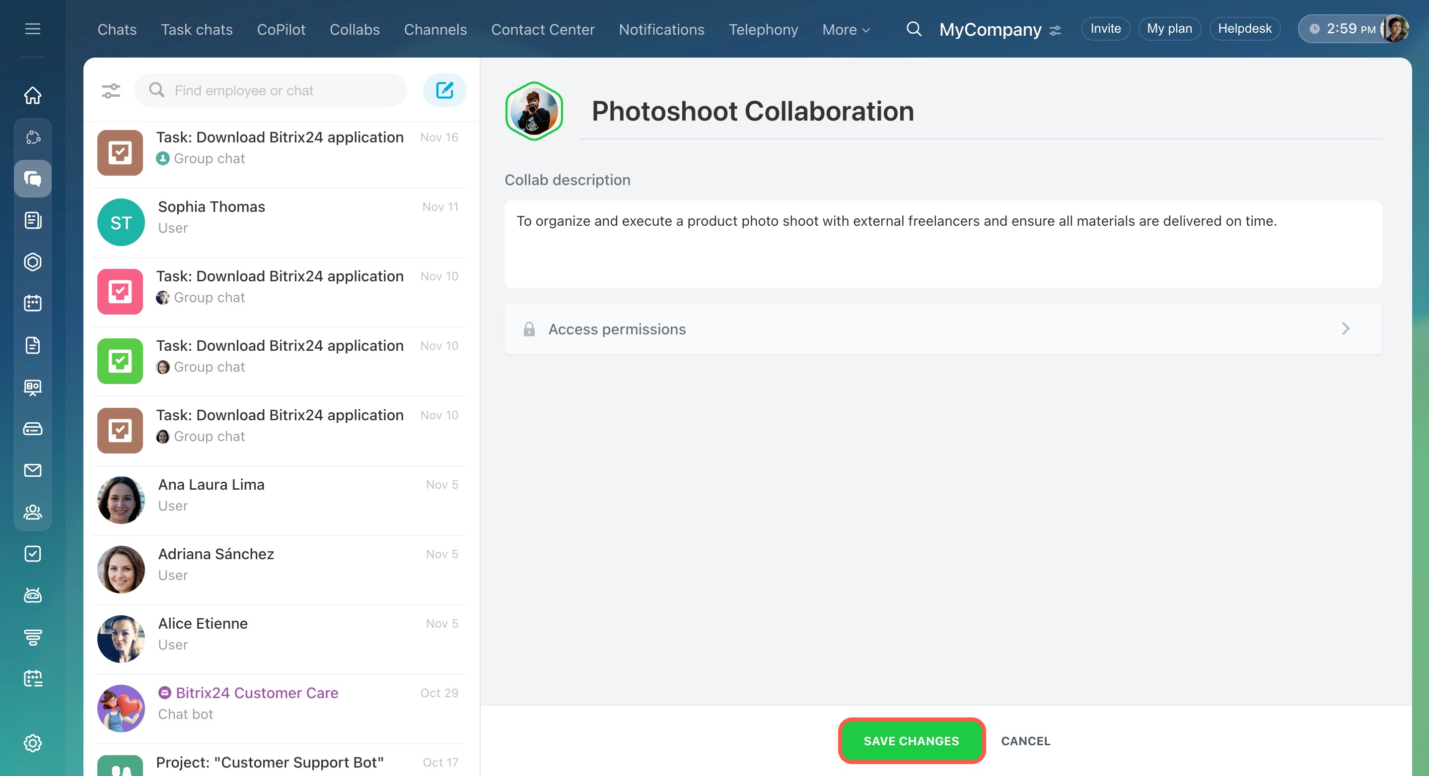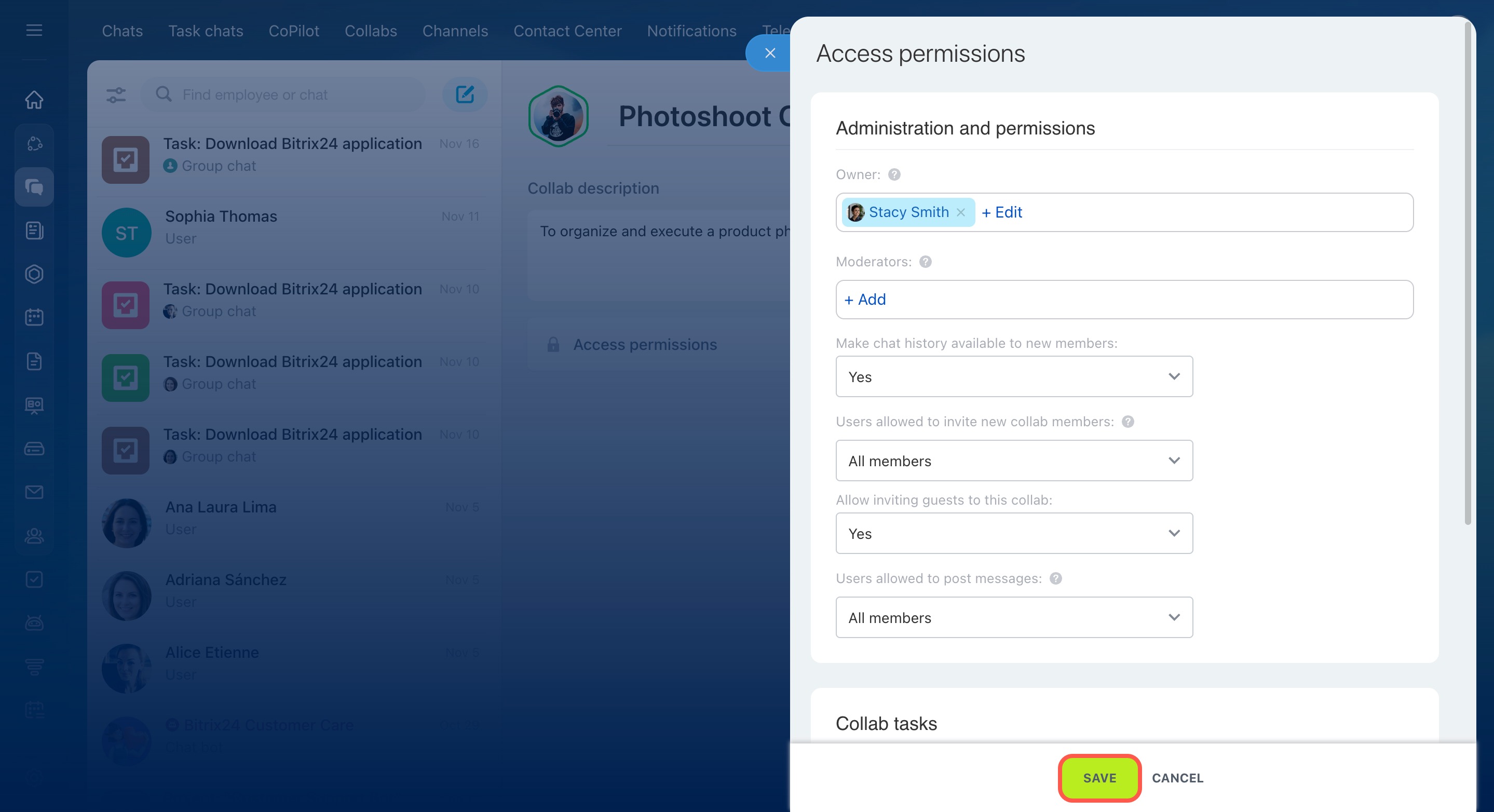 Déterminez qui peut voir, modifier et supprimer les tâches et cliquez sur Enregistrer. Ensuite, cliquez sur Enregistrer les modifications dans les paramètres généraux de la collab.