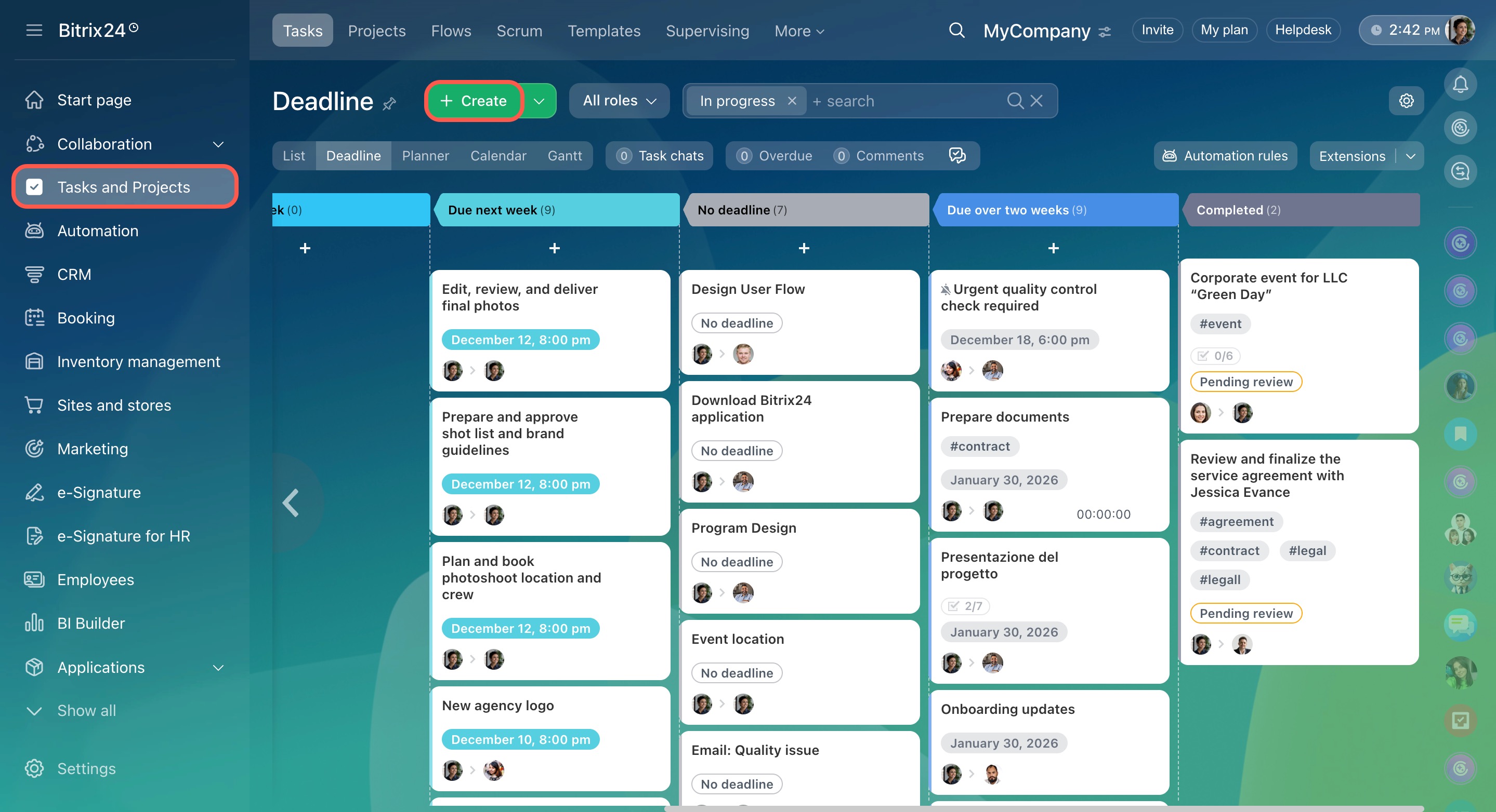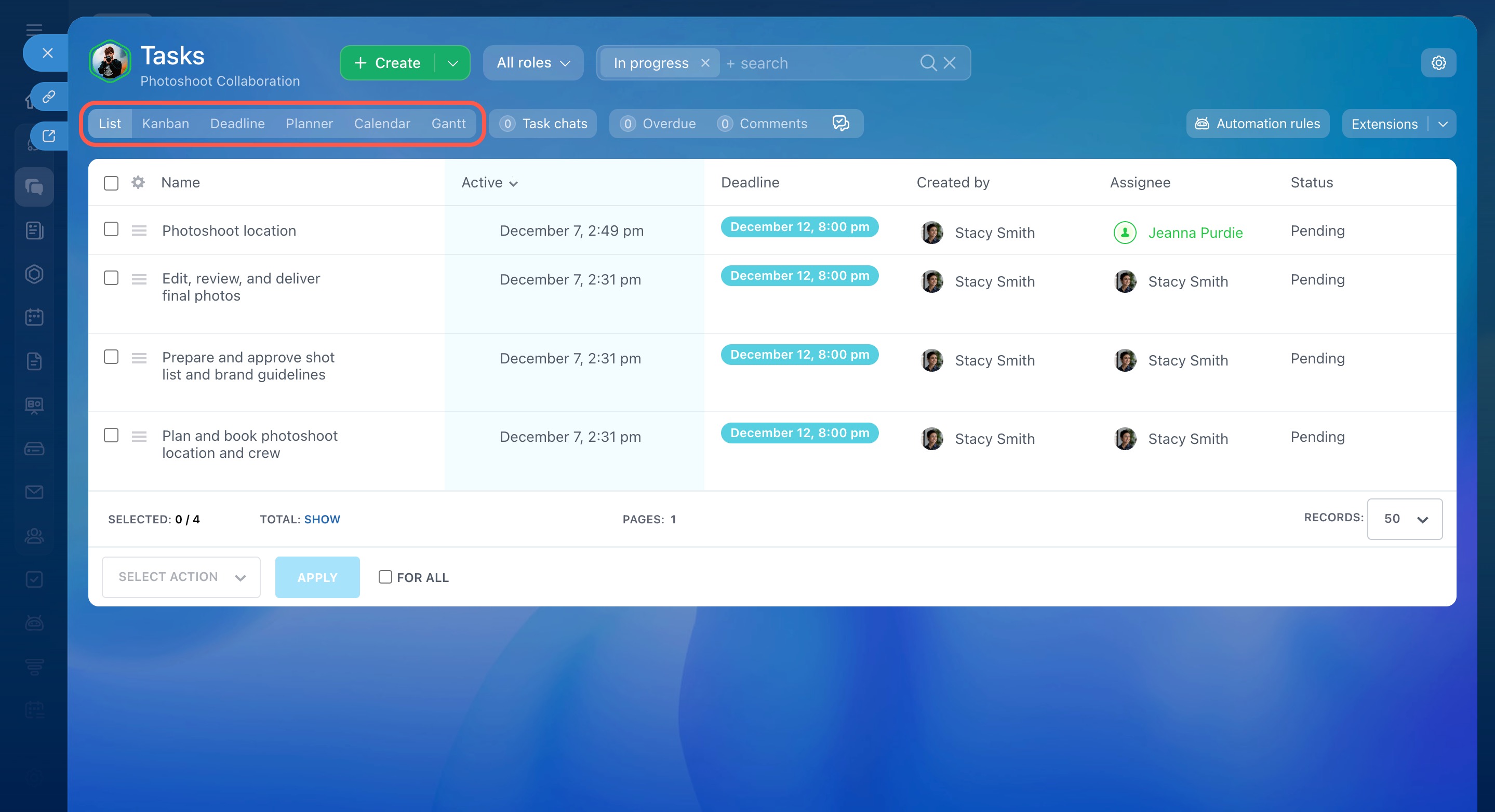 Surveillez comment les participants de la collab travaillent sur les tâches et choisissez le mode de travail avec les tâches qui vous convient : Liste, Kanban, Date limite, Planificateur, Calendrier ou Gantt. Par exemple, Kanban est composé d'étapes que vous créez pour travailler avec les tâches.