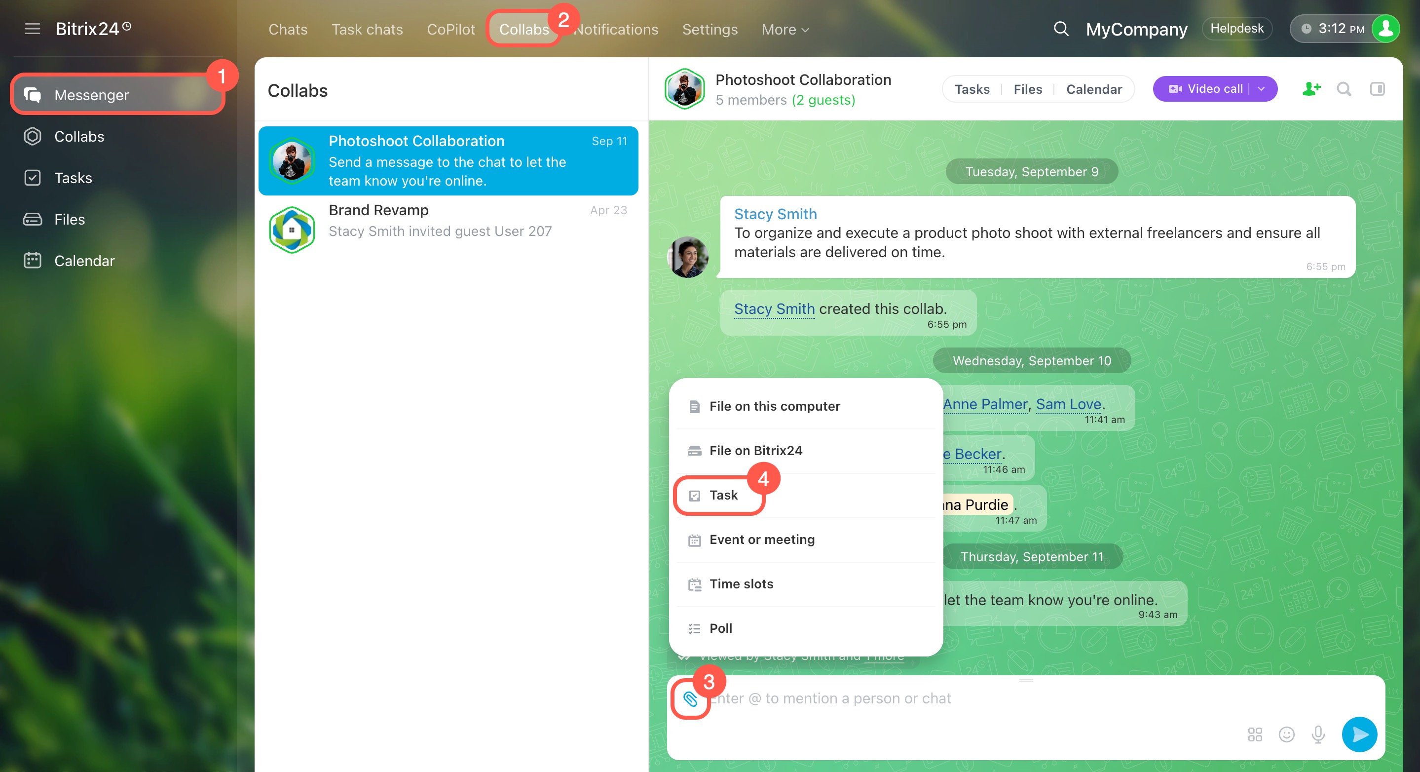 Dans la discussion de la collab. Ouvrez la section Messenger. Cliquez sur Collabs et sélectionnez celle souhaitée. Dans le chat de la collab, cliquez sur l'icône de trombone et sélectionnez Tâche.