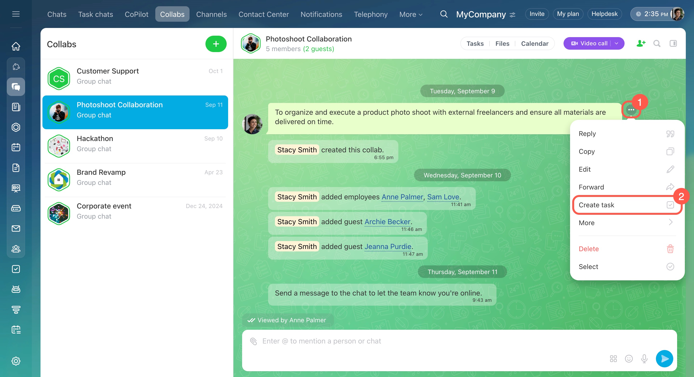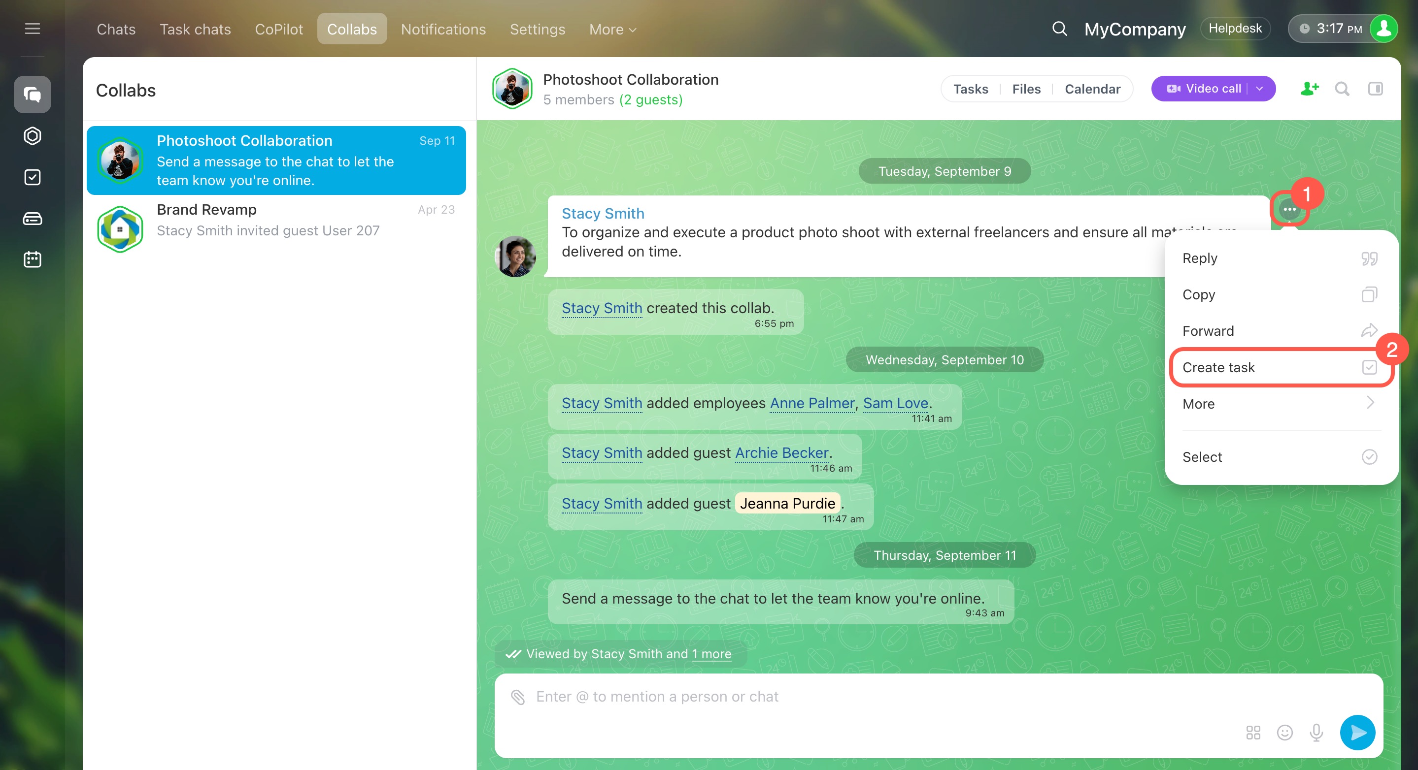 À partir d'un message. Sélectionnez un message dans le chat de la collab et cliquez sur Trois points (...) - Créer - Tâche. Le texte du message et l'auteur apparaîtront dans la description de la tâche.
