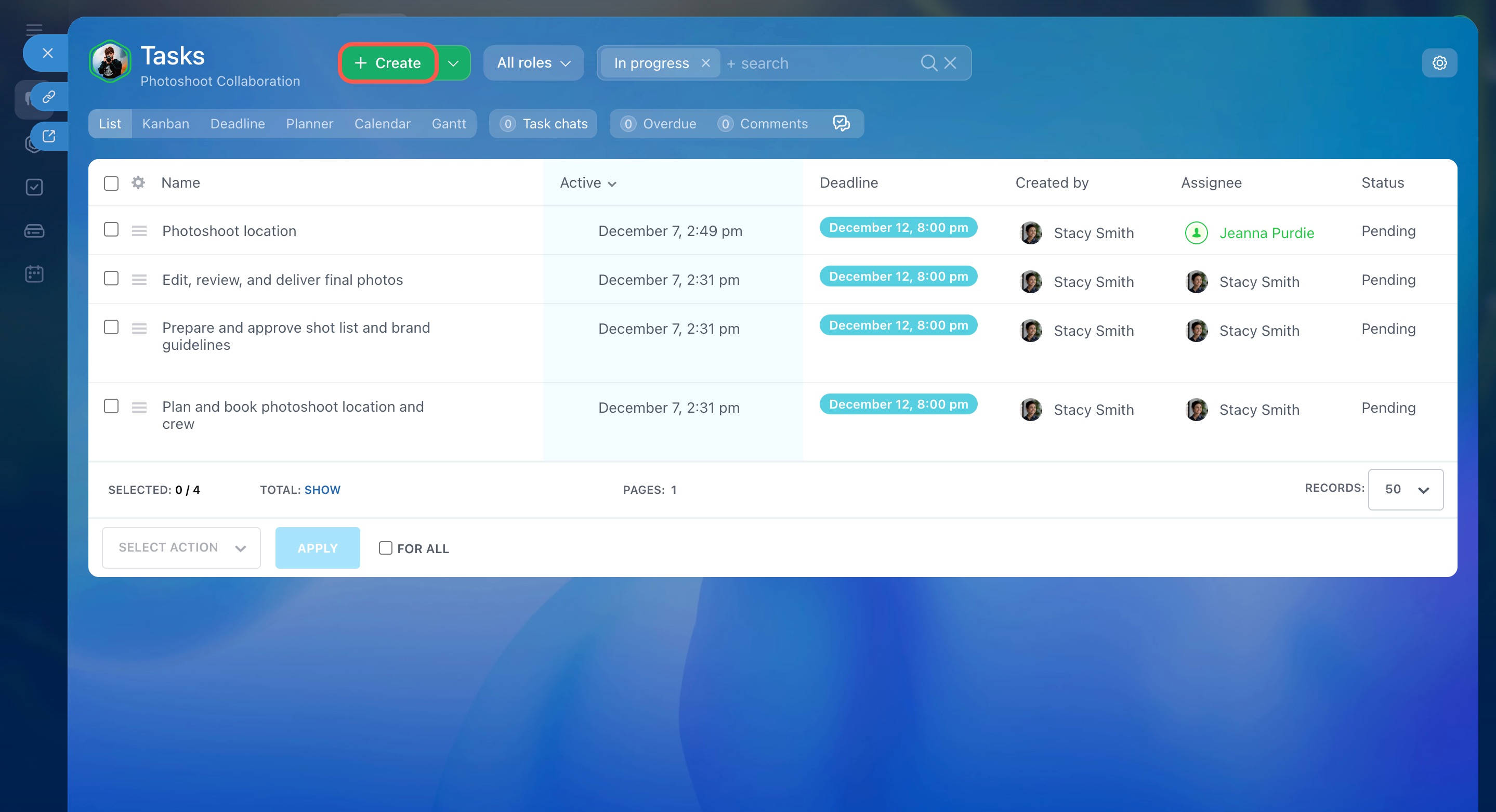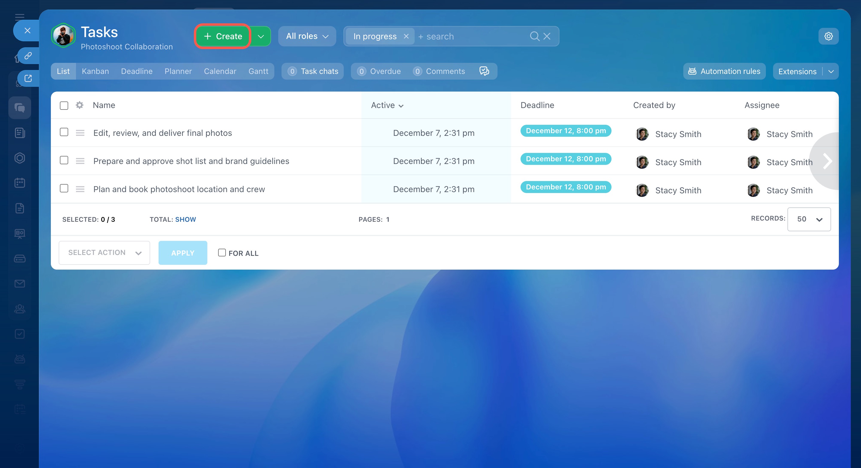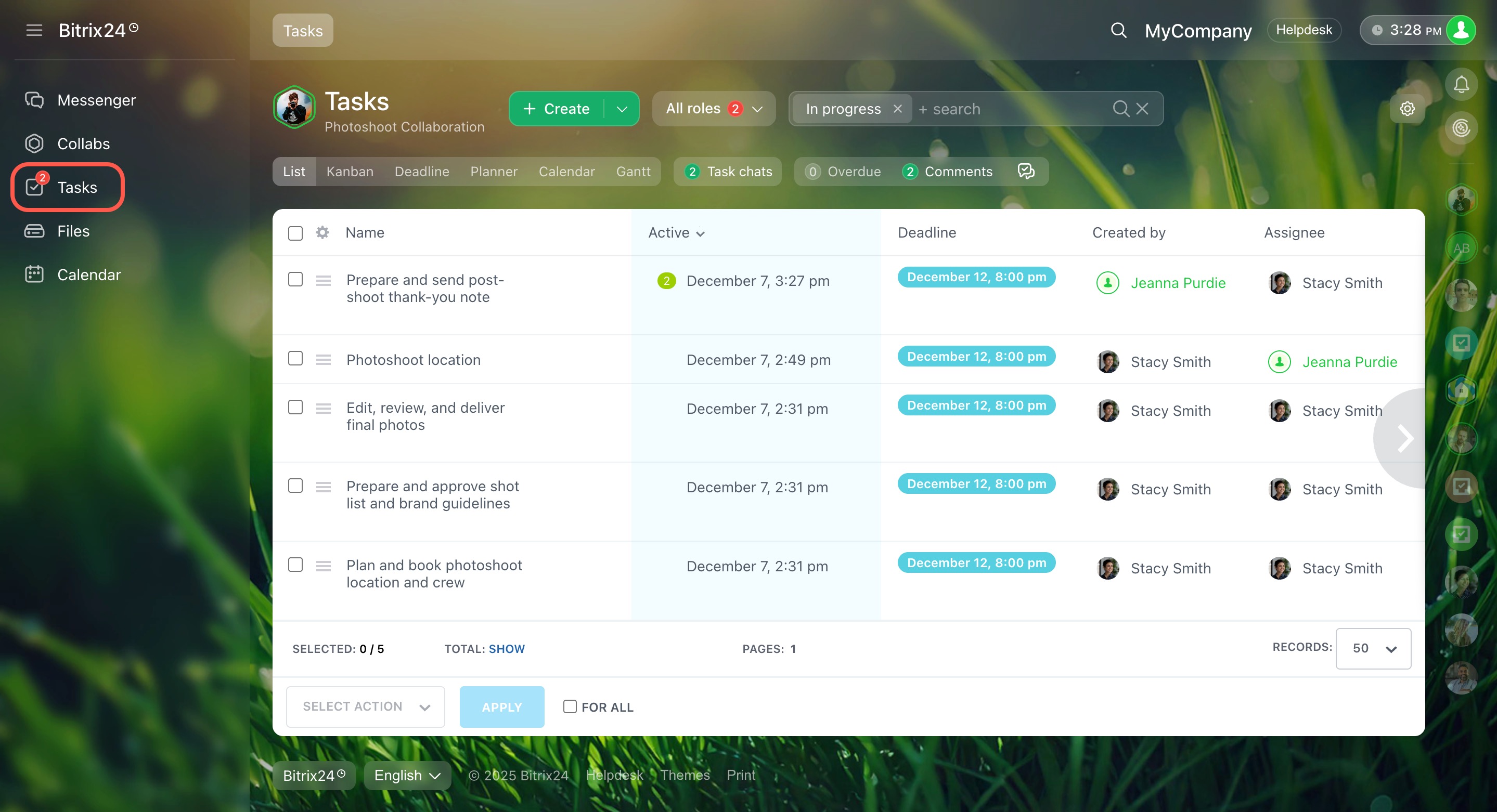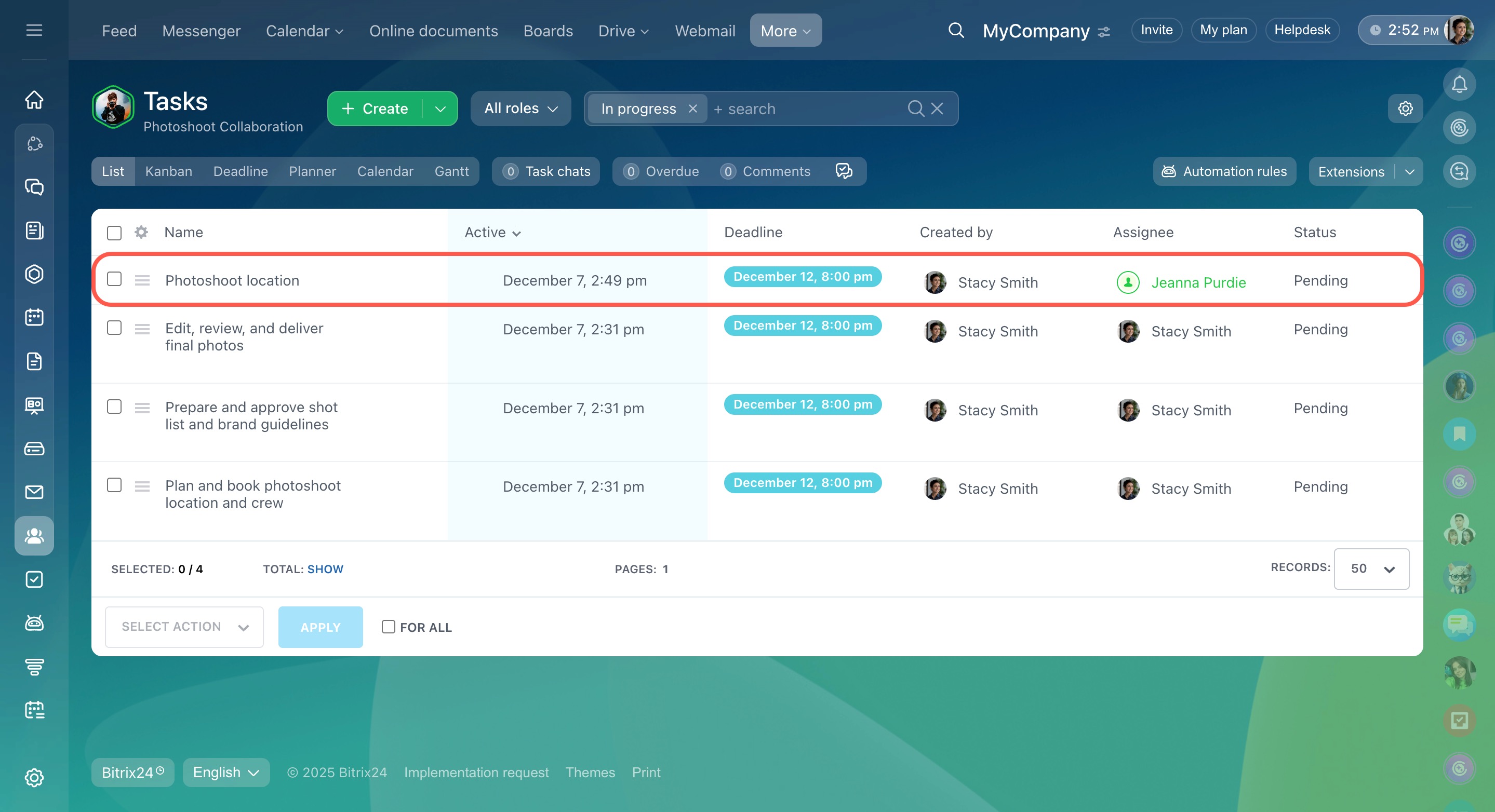 Après la création, la tâche apparaîtra dans la liste générale des tâches de la collab. Toutes les tâches créées par les invités sont uniquement liées aux collabs.