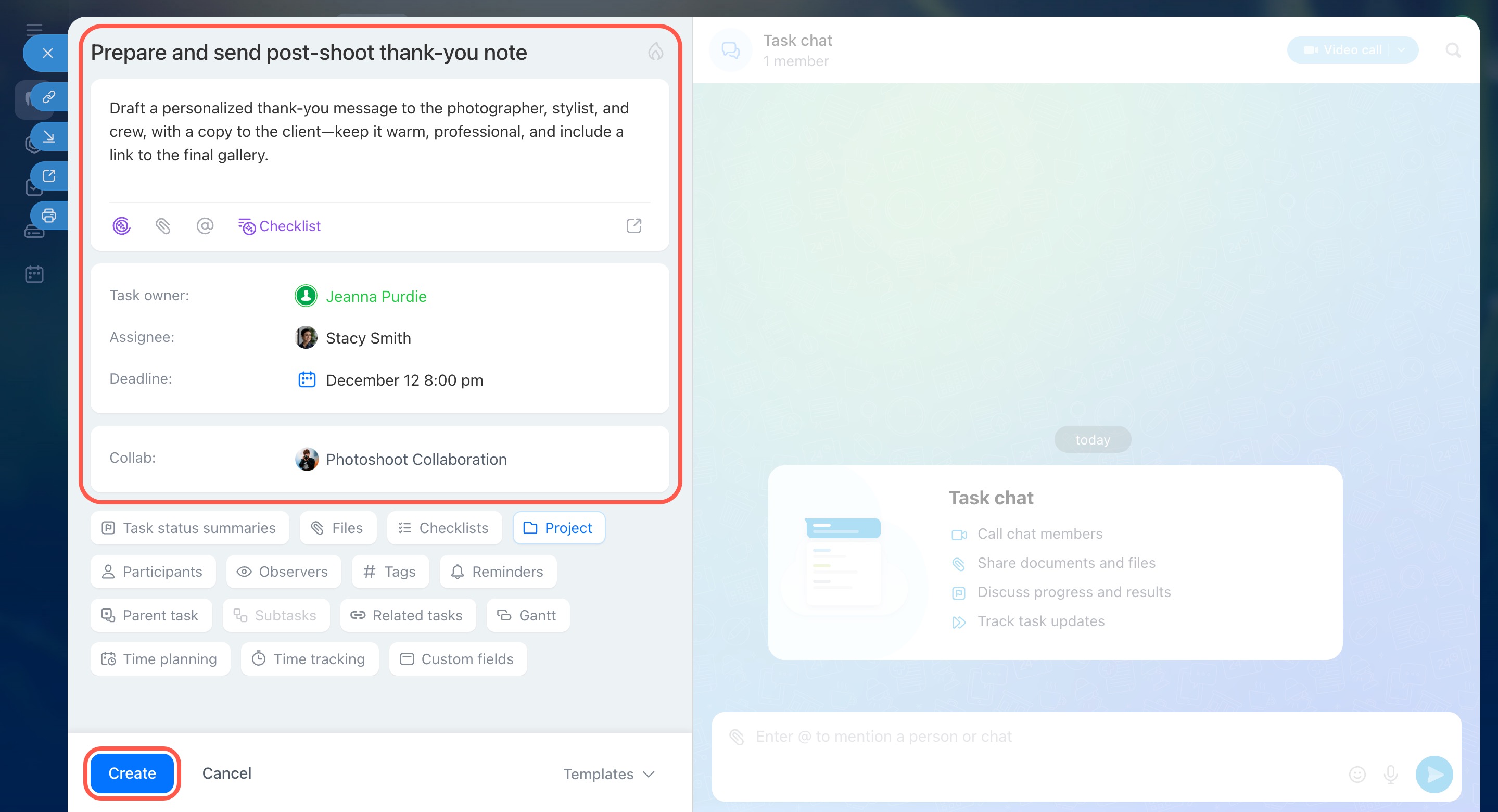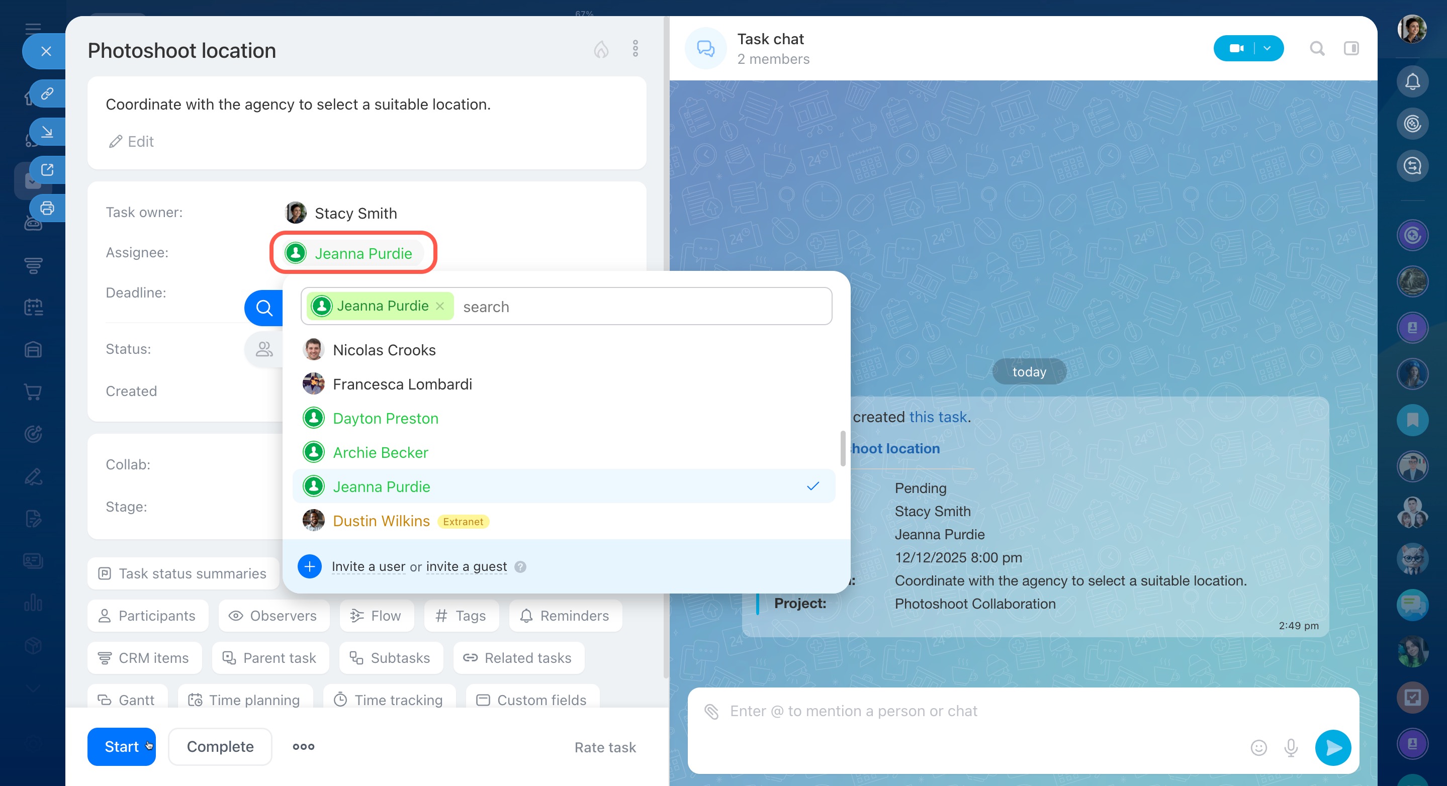 Saisissez le titre et la description de la tâche, indiquez des paramètres supplémentaires : date limite, liste de contrôle, tags et autres. L'employé qui a créé la tâche est automatiquement désigné comme responsable, mais il peut être changé. Les invités externes de la collab sont surlignés en vert dans la liste, ce qui permet de les distinguer des employés ordinaires.
