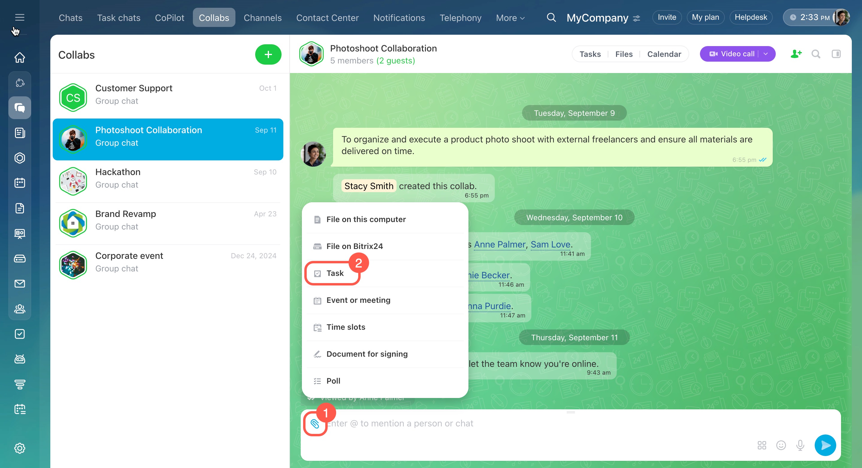 Dans la discussion. Accédez au chat de la collab, cliquez sur le trombone et sélectionnez Tâche.