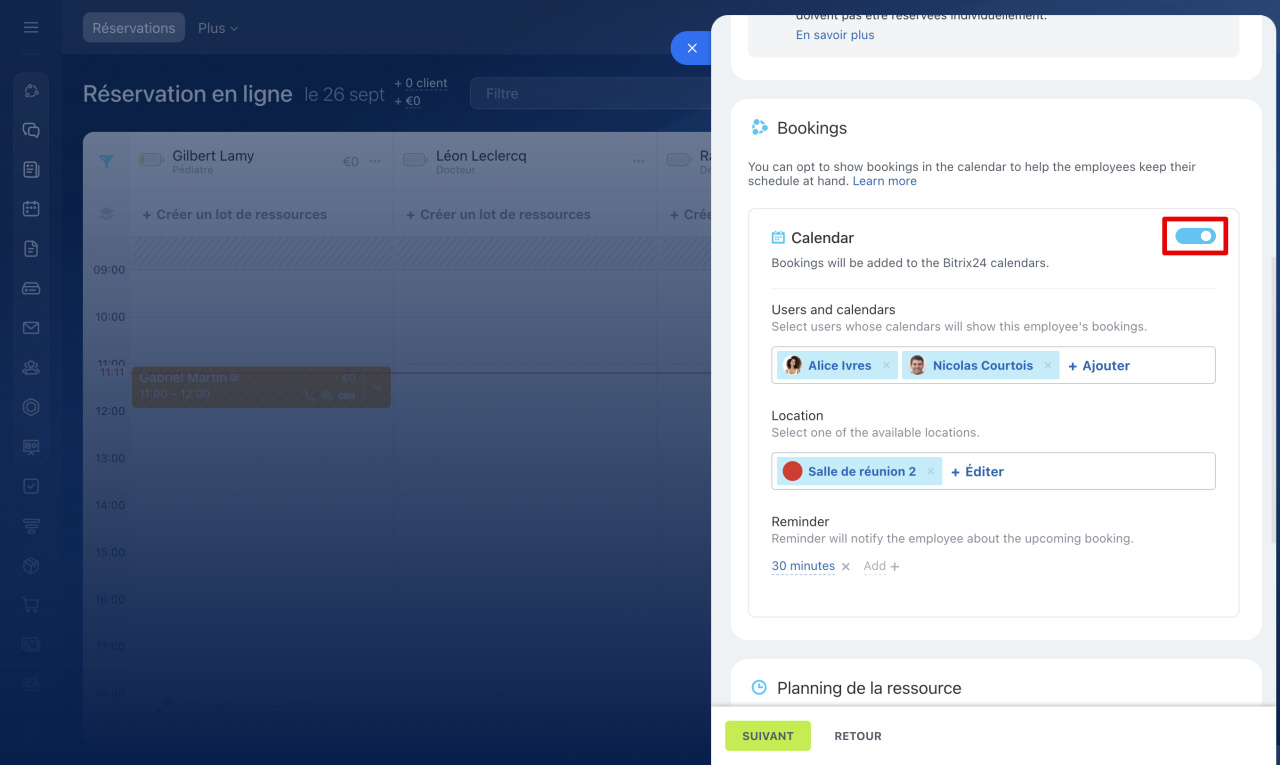 Enregistrement des réservations dans le calendrier. Activez l'option Calendrier pour lier la réservation en ligne au calendrier Bitrix24. Ainsi, toutes les réservations apparaîtront automatiquement dans les calendriers personnels des employés. Les spécialistes pourront consulter leur emploi du temps immédiatement sans perdre de temps à chercher les réservations ailleurs. Configurez les paramètres suivants :