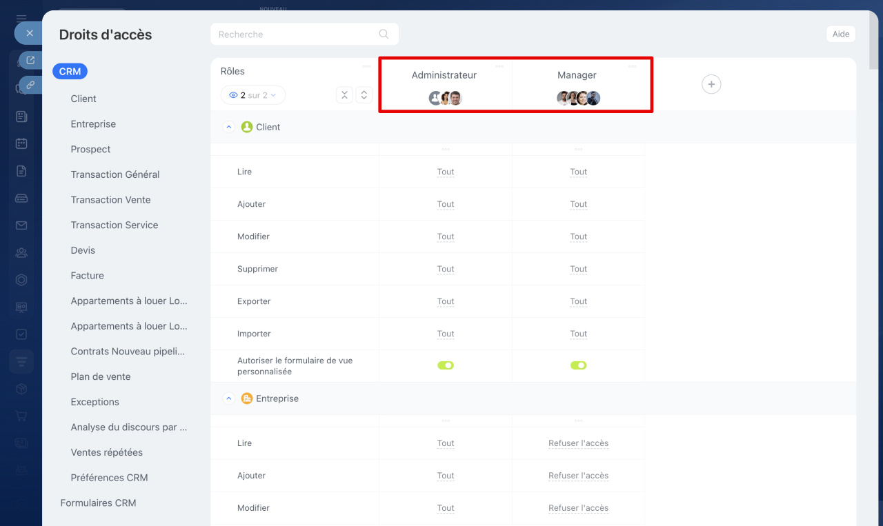 - Par défaut, les paramètres de droits CRM incluent deux rôles : administrateur et manager.