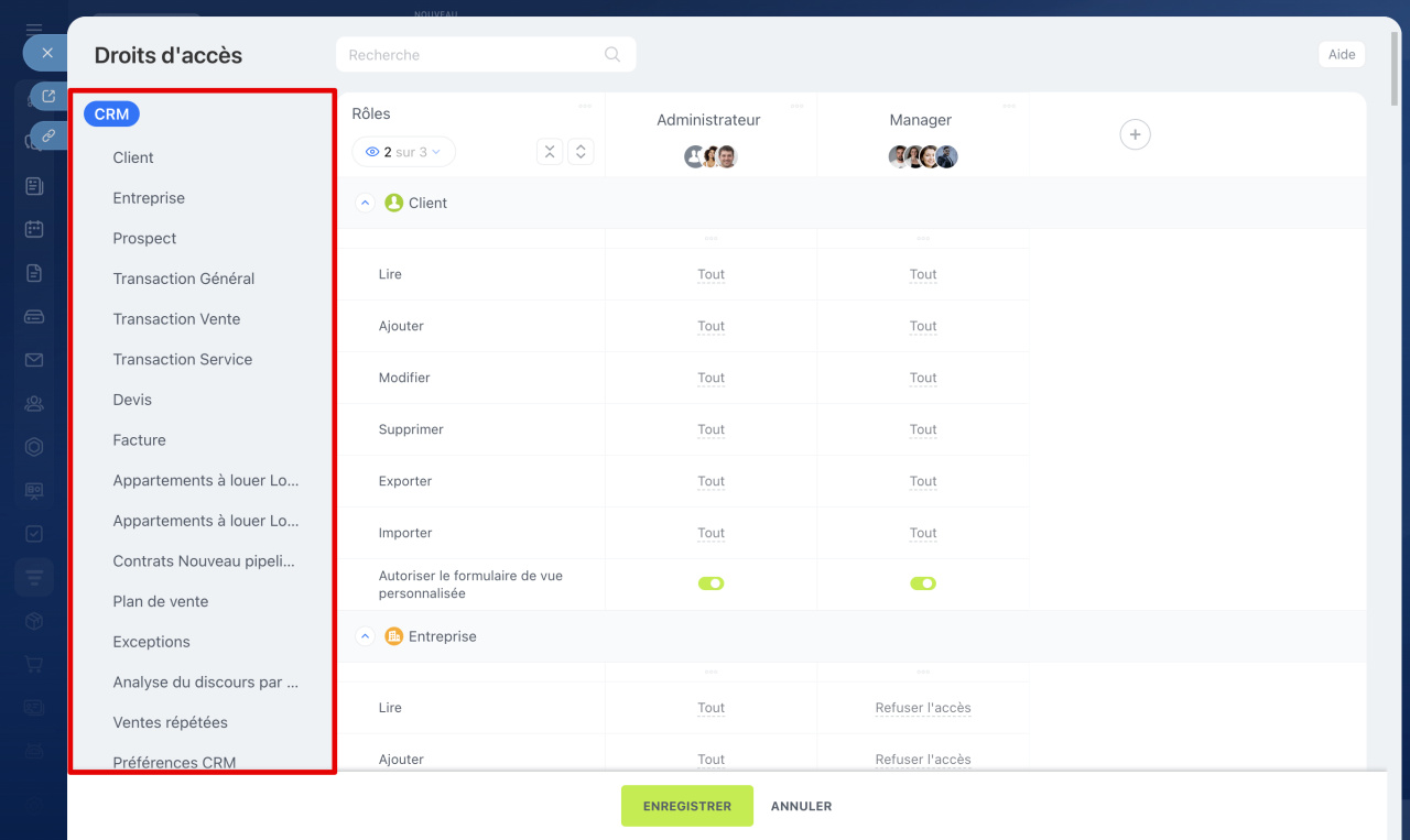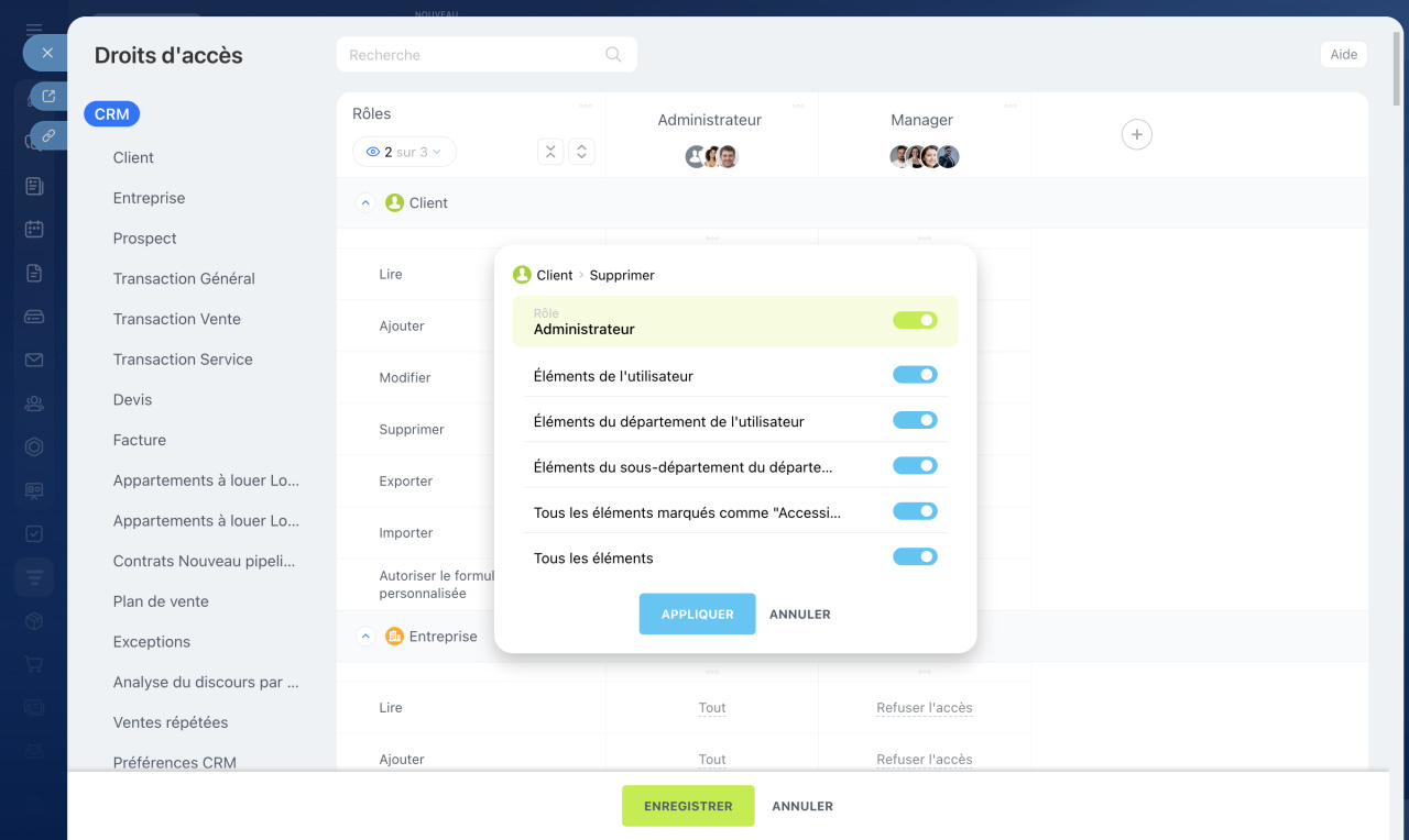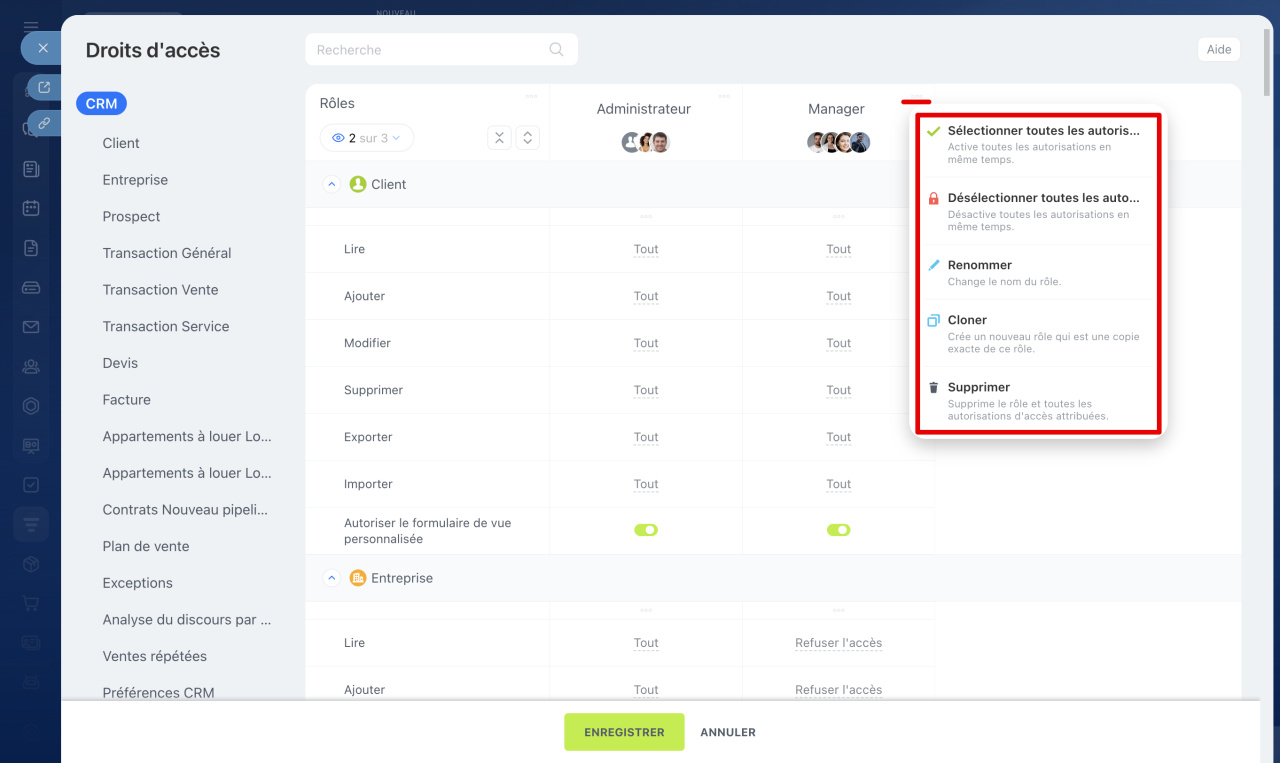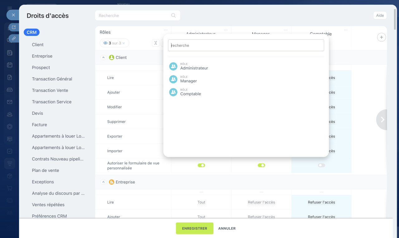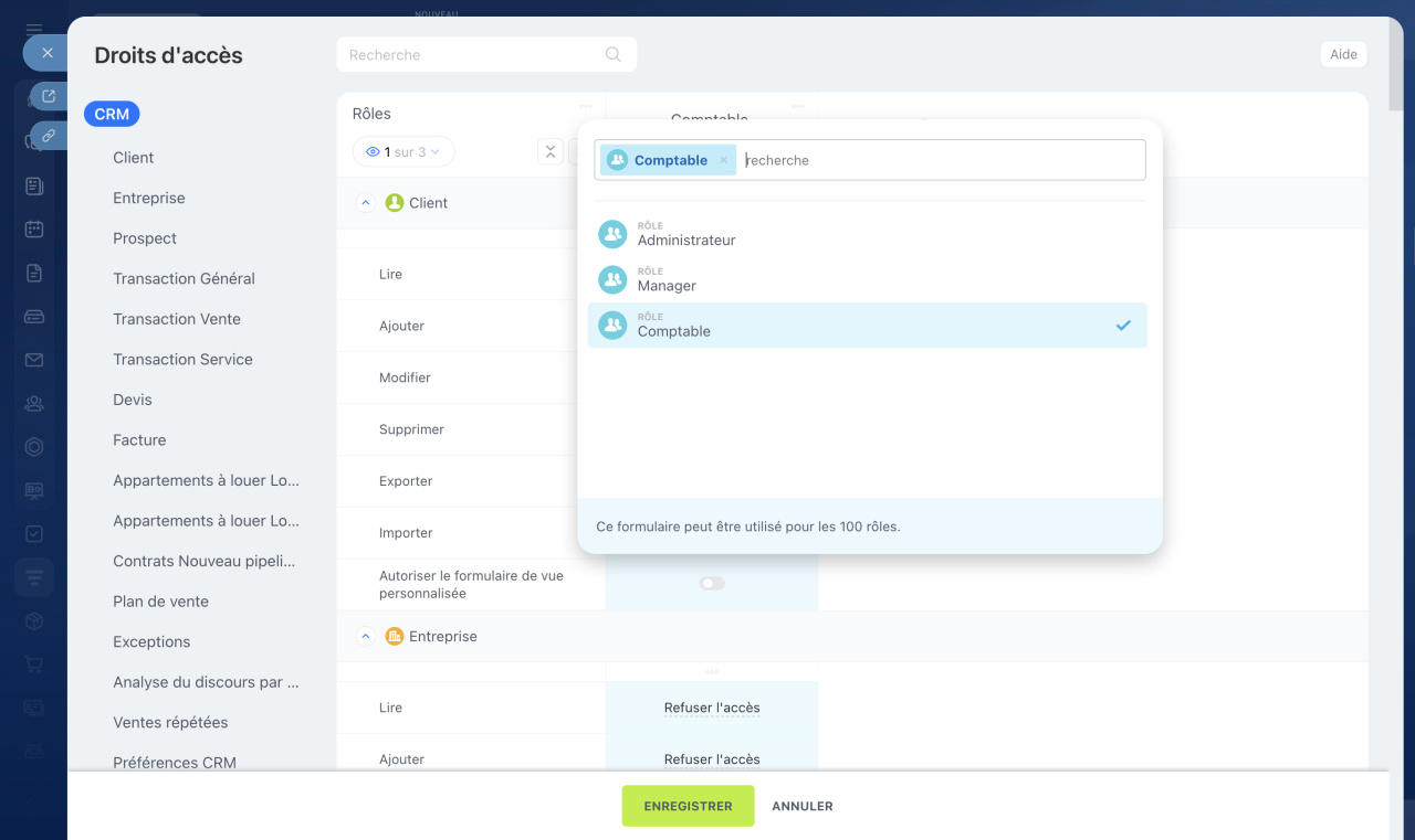 Pour chaque rôle, il est possible de configurer les droits d'accès pour effectuer des actions sur des éléments spécifiques du CRM.