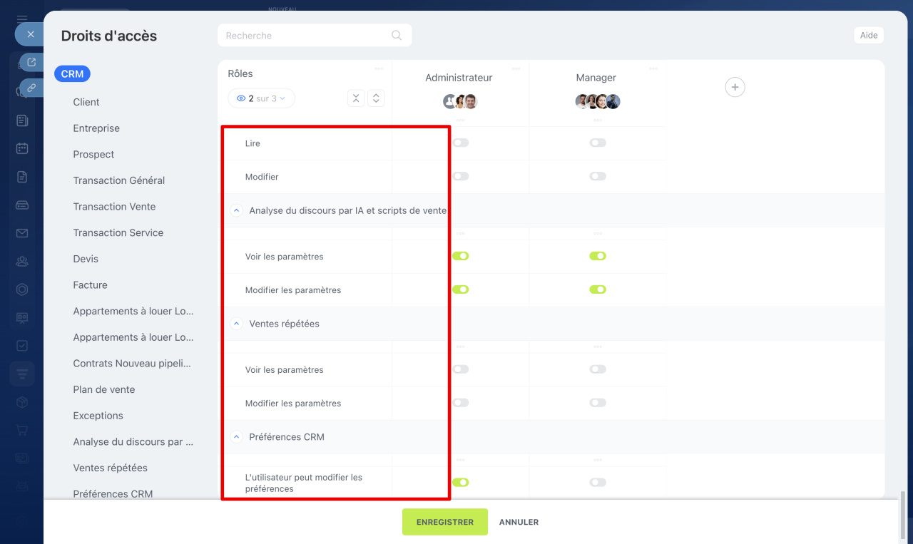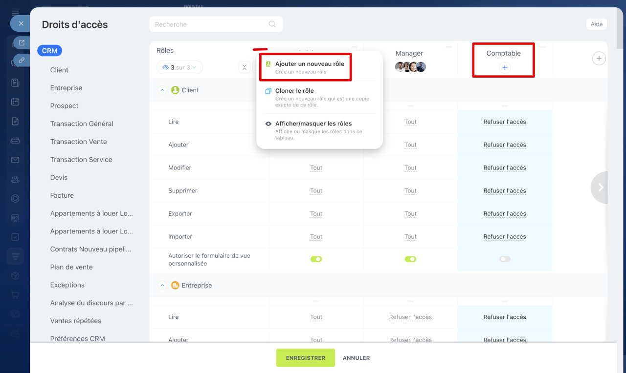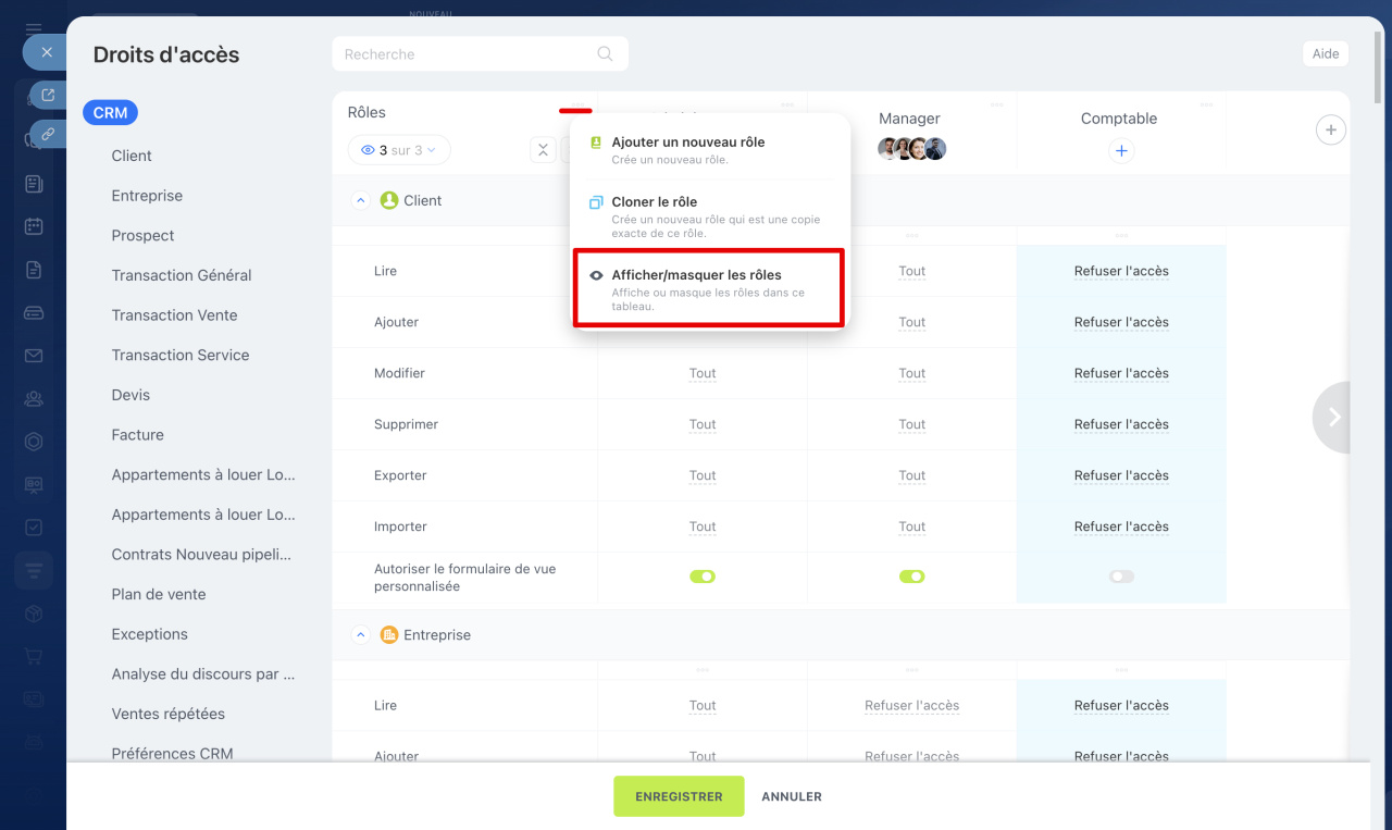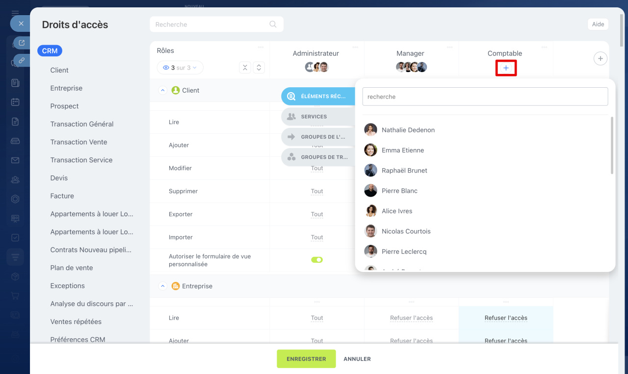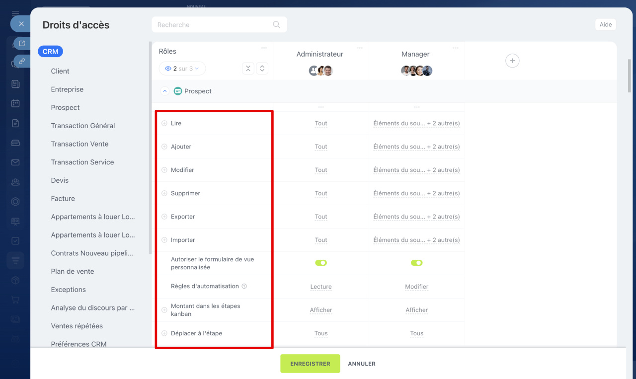 Pour chaque rôle, il est possible de configurer les droits d'accès pour effectuer des actions sur des éléments spécifiques du CRM.