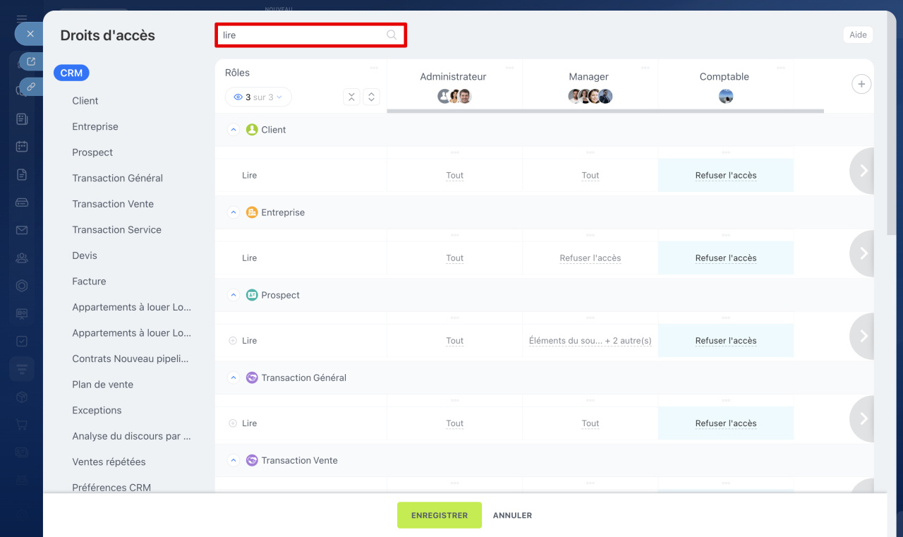 - Éléments du CRM - saisissez le nom de l'élément, par exemple prospect ou entreprise. Tous les droits d'accès que vous pouvez configurer pour eux s'afficheront.