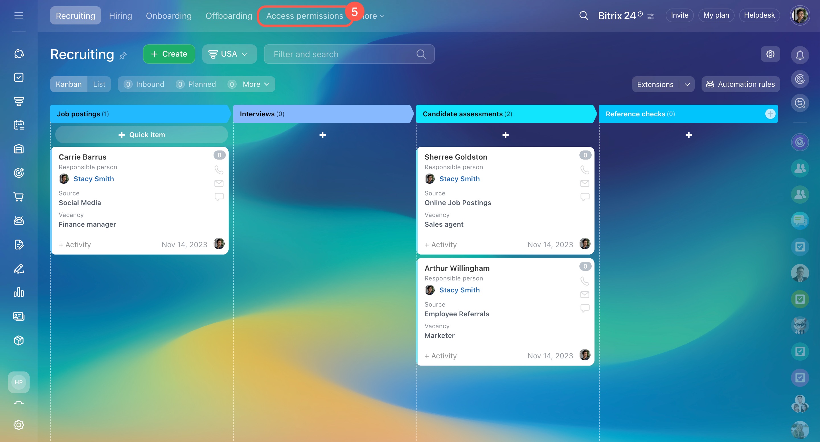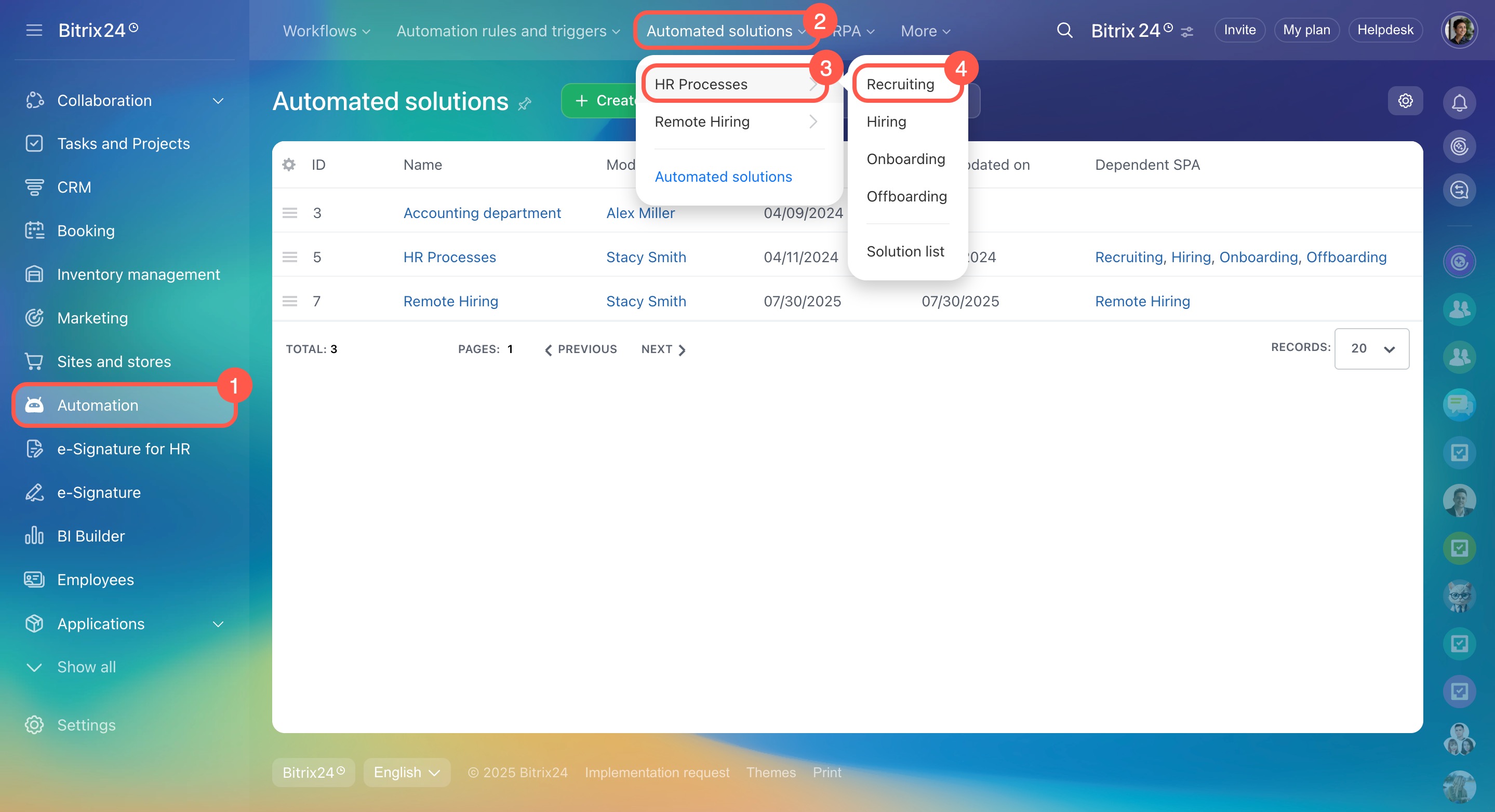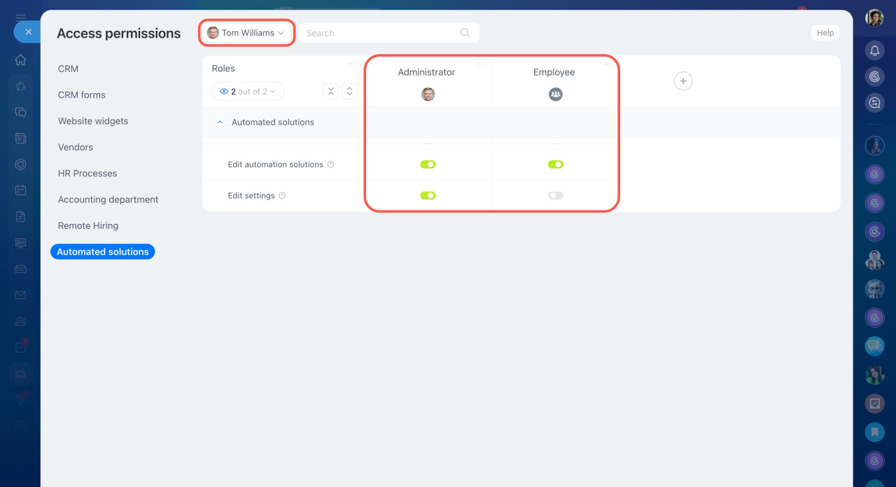 Les solutions automatisées sont une section dédiée aux processus intelligents, permettant d'automatiser le travail de n'importe quel département d'une entreprise. Dans Bitrix24, des paramètres distincts de droits d'accès aux solutions automatisées ont été introduits.