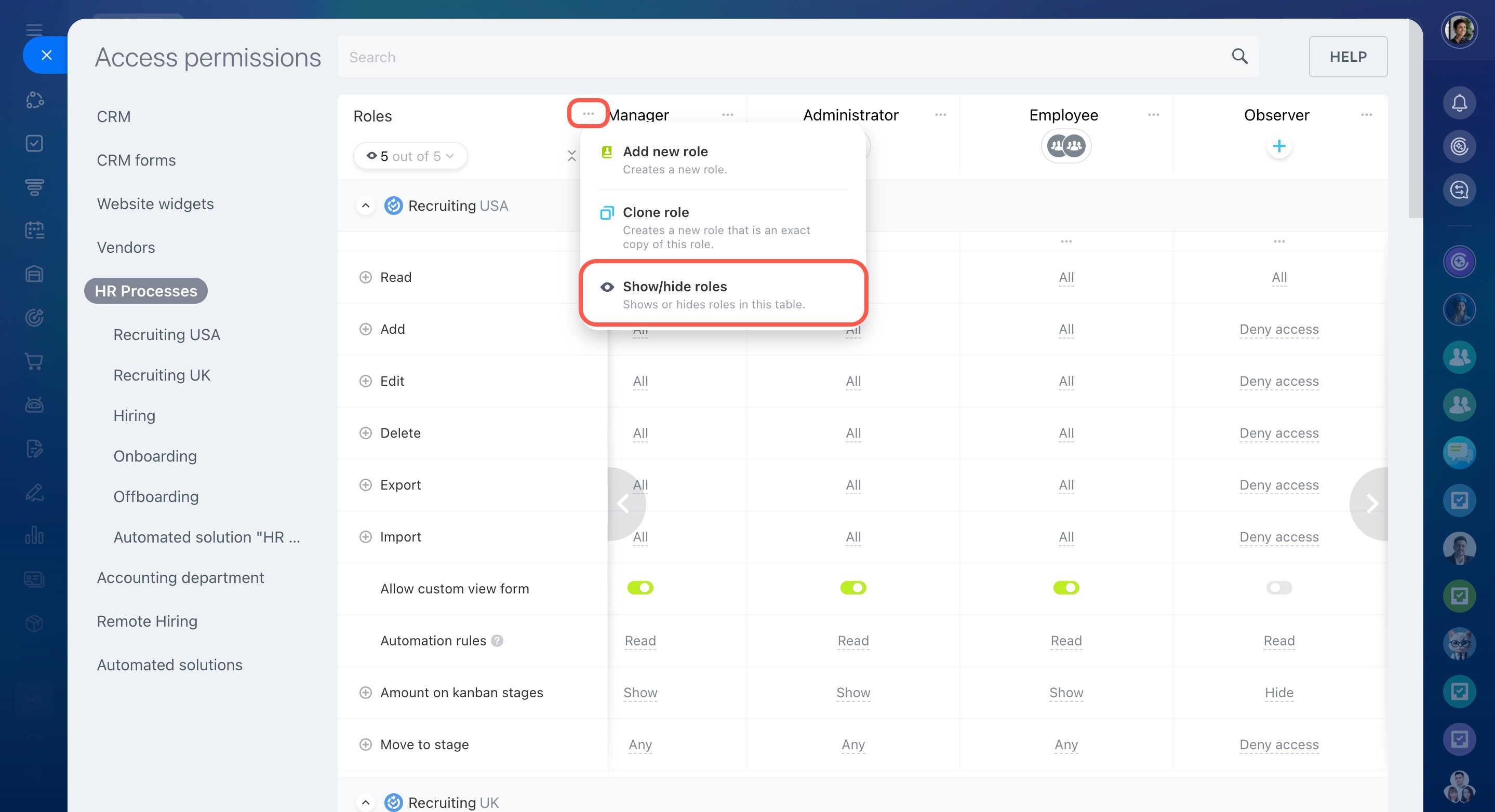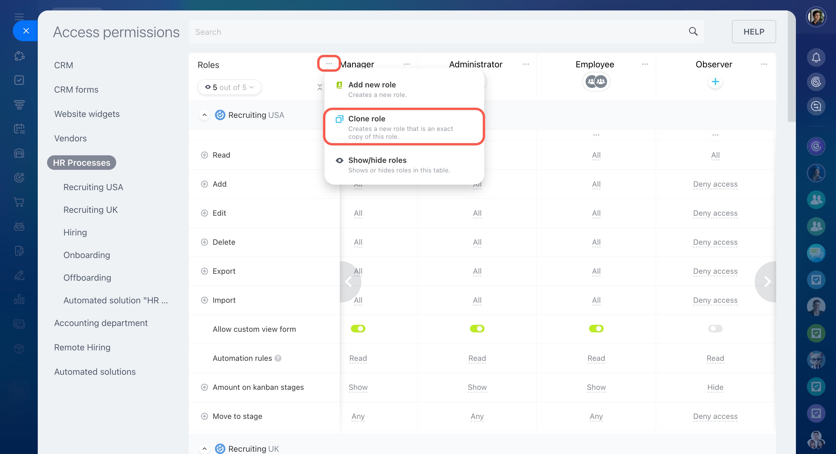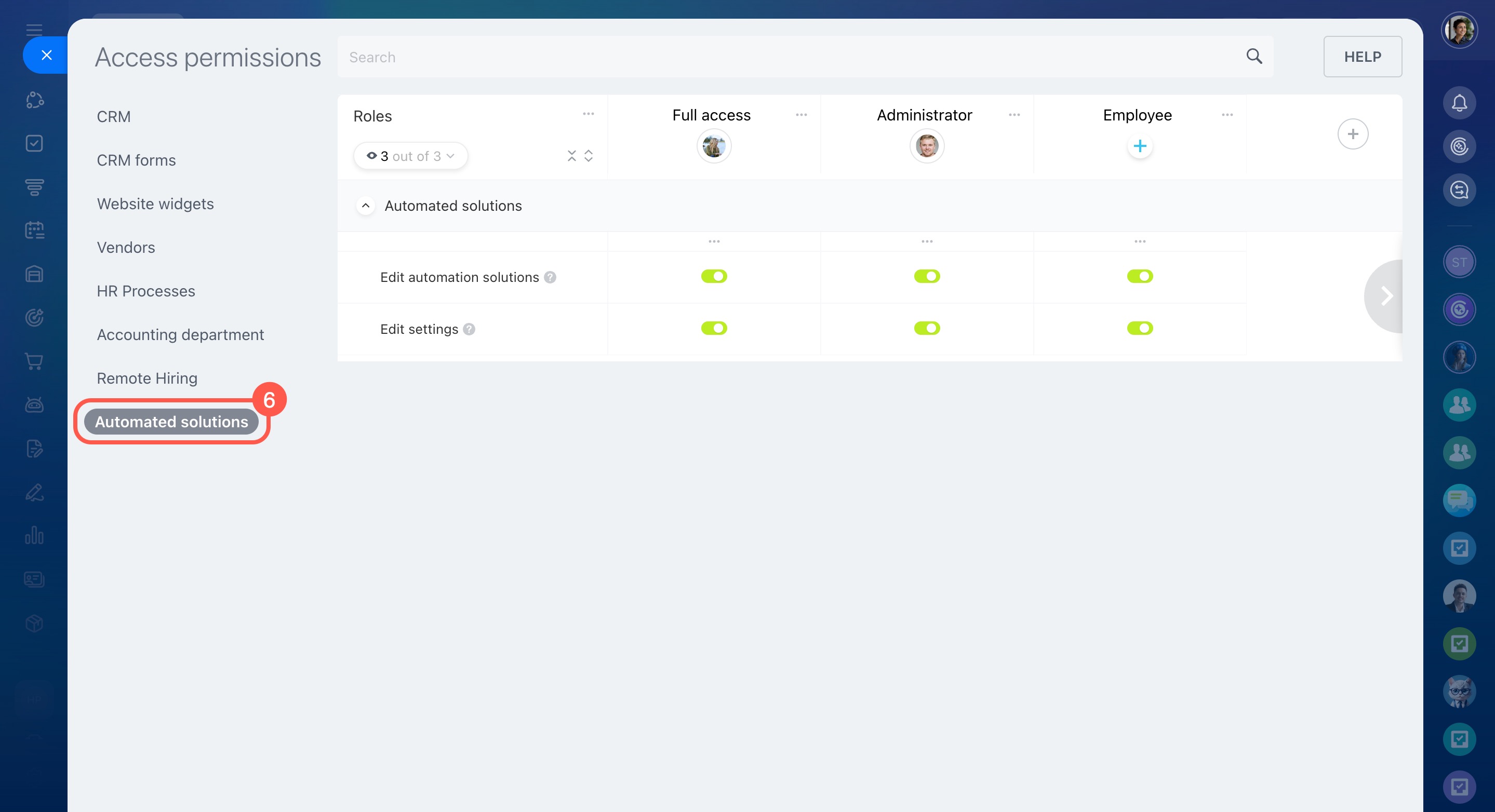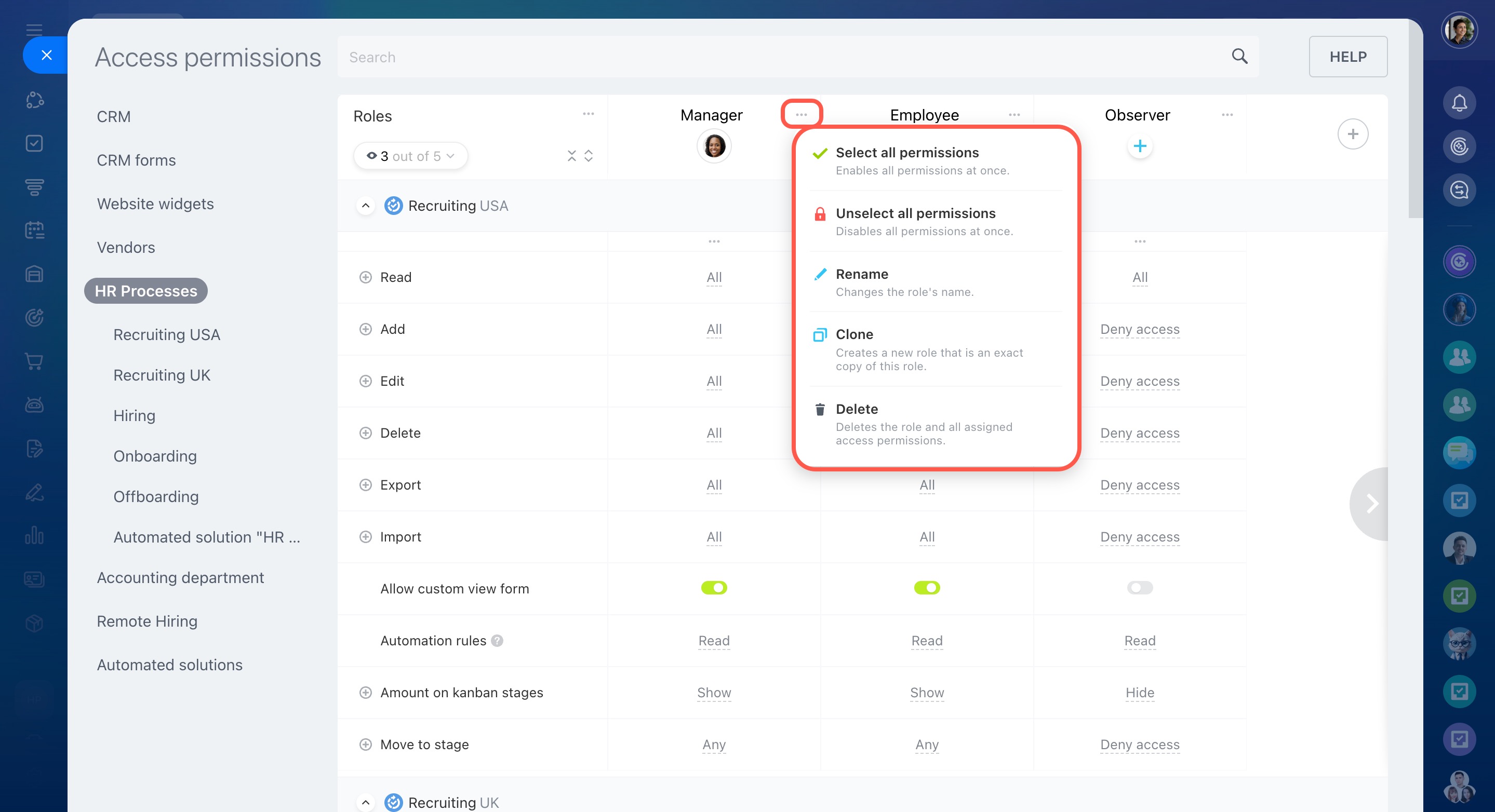 Modifier les paramètres - la possibilité de configurer les droits d’accès au CRM.