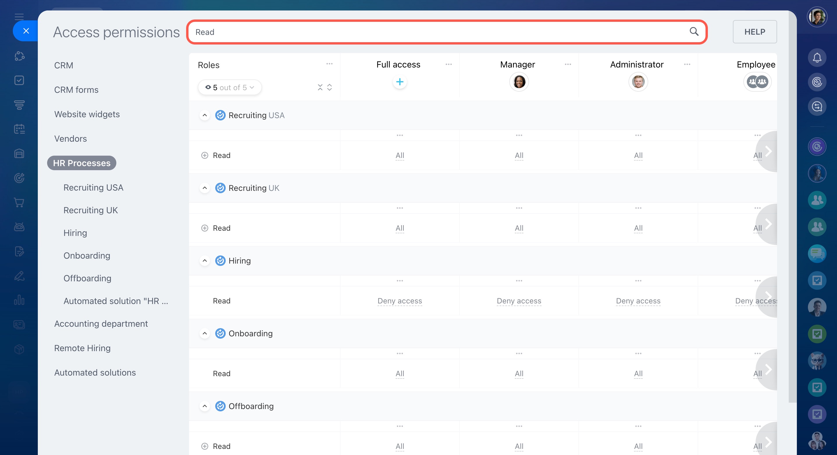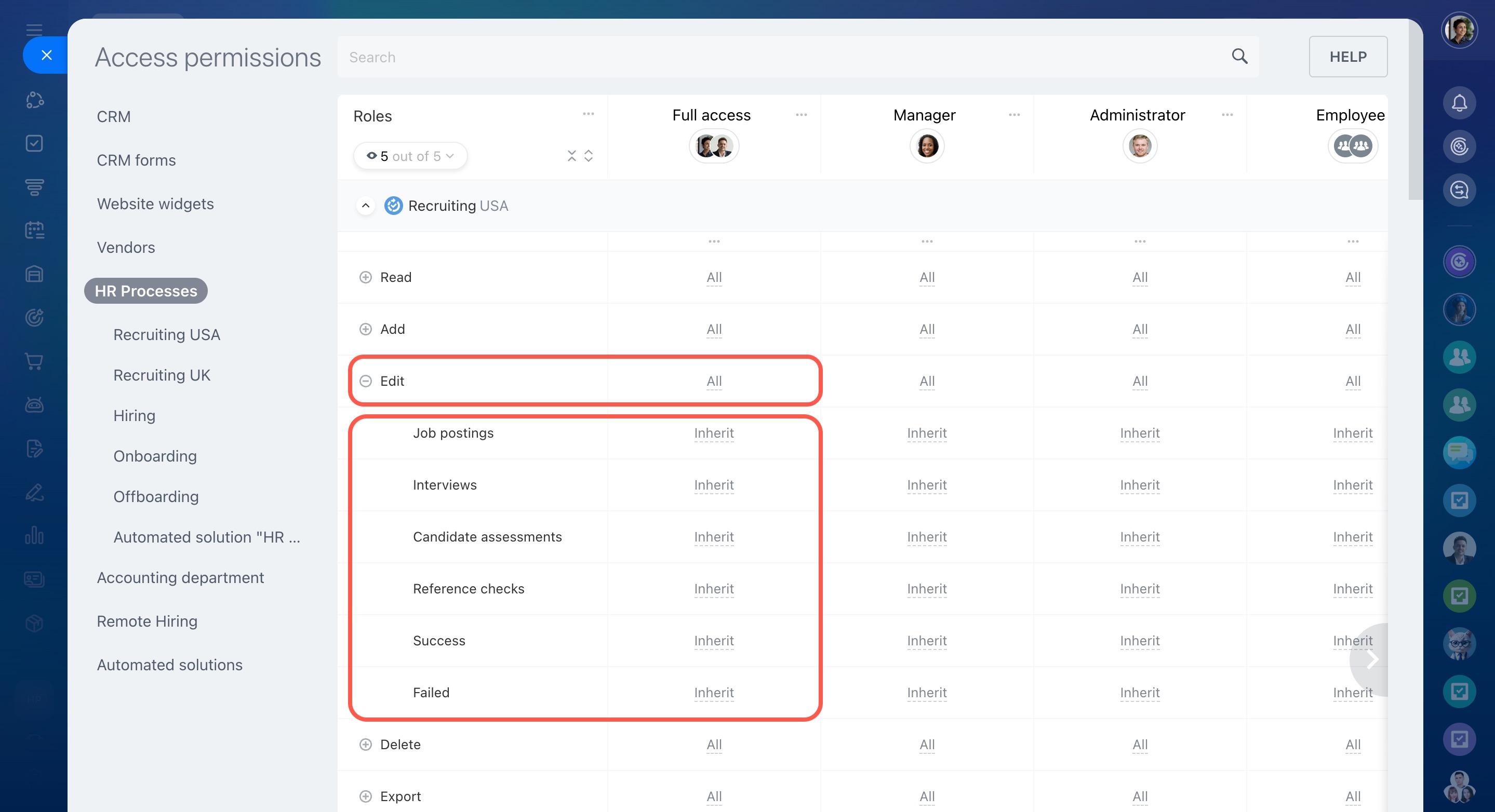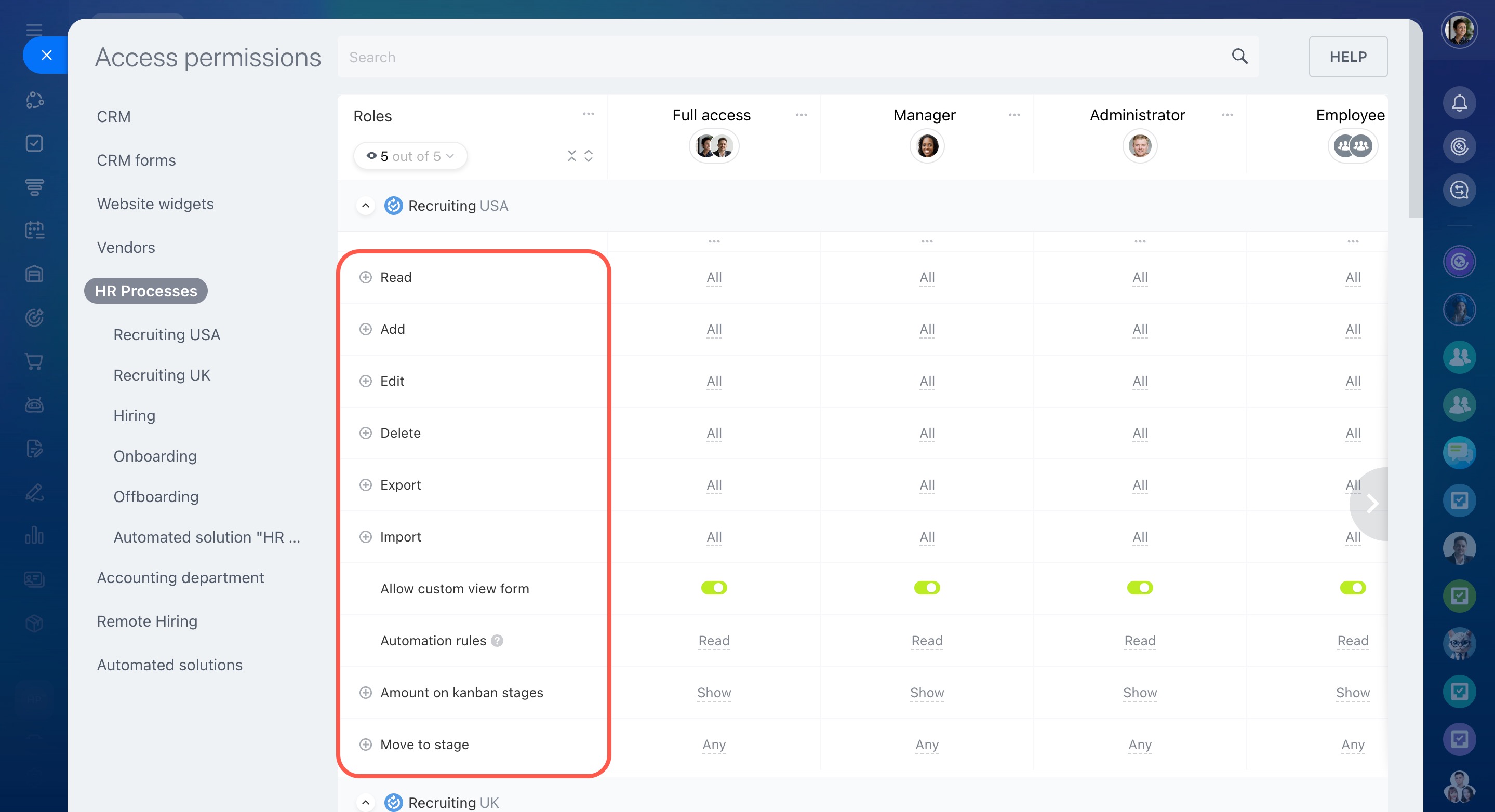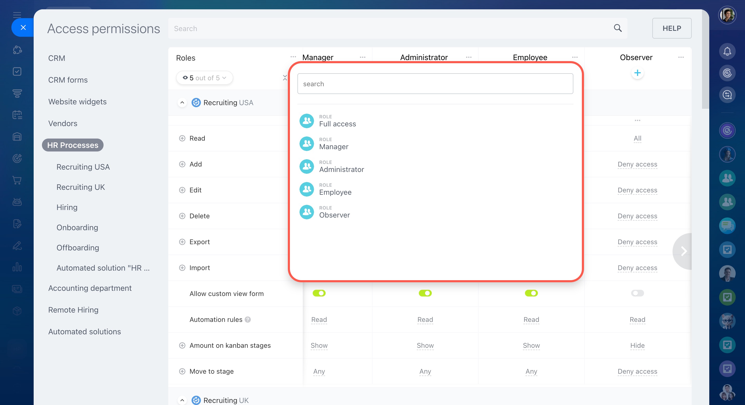Modifier les paramètres - la possibilité de configurer les droits d’accès au CRM.
