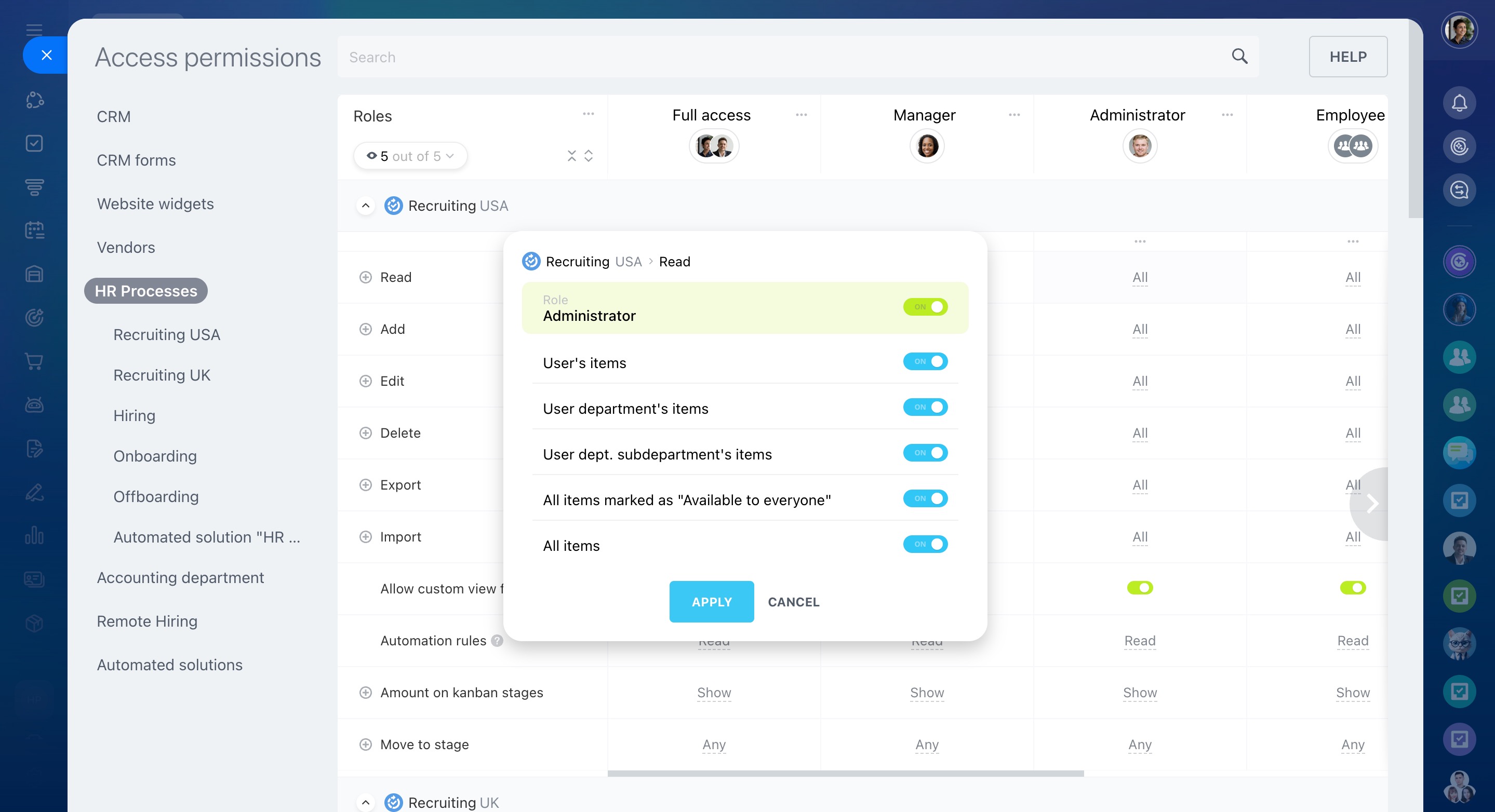 Vous pouvez créer des rôles avec des droits différents pour les départements et les employés. Par exemple, le département des RH aura un accès complet à la solution automatisée pour le recrutement, tandis que les managers n'auront qu'un accès en lecture seule aux éléments.