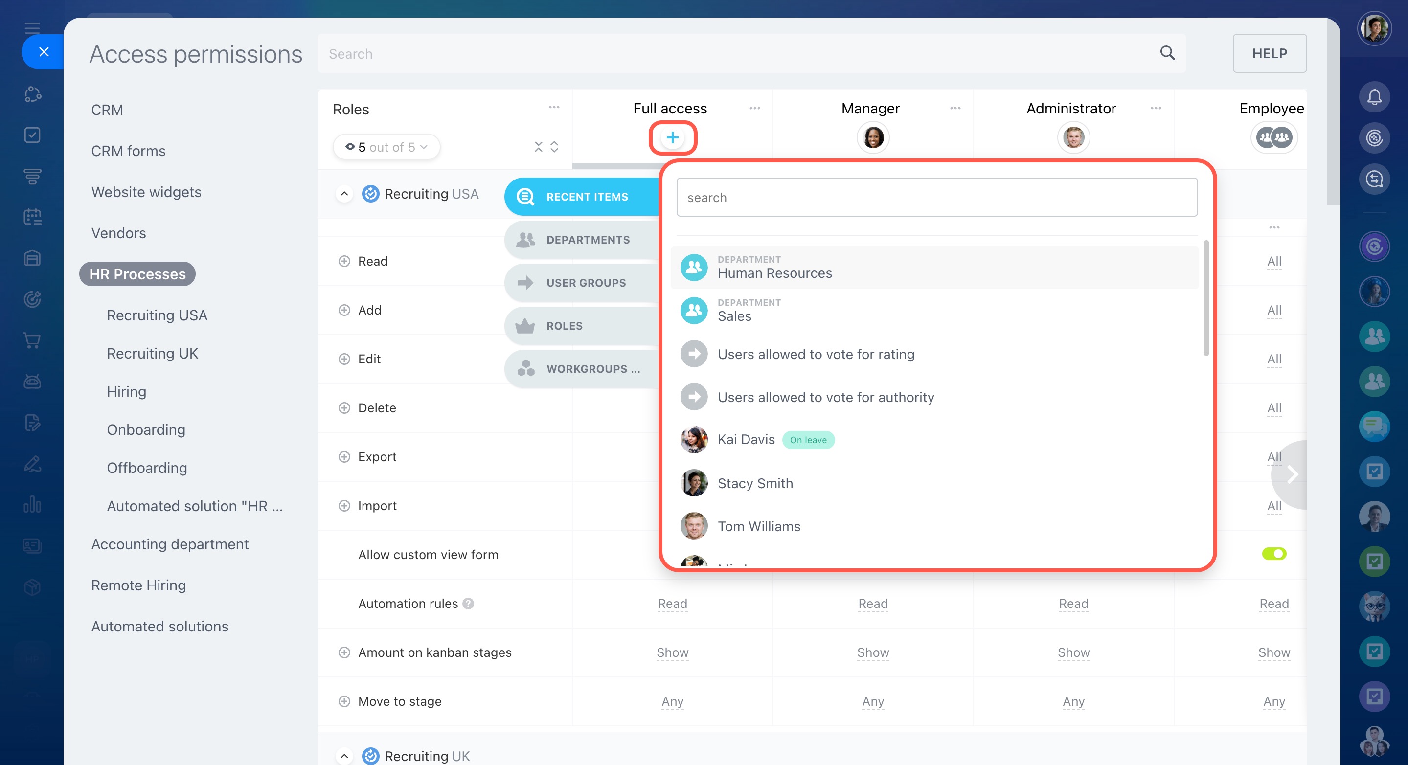 Cliquez sur Plus (+) sous le rôle souhaité et sélectionnez un employé, un département ou un groupe. Par exemple, un superviseur pourra modifier et supprimer des éléments du processus intelligent, tandis que les managers pourront uniquement les consulter.