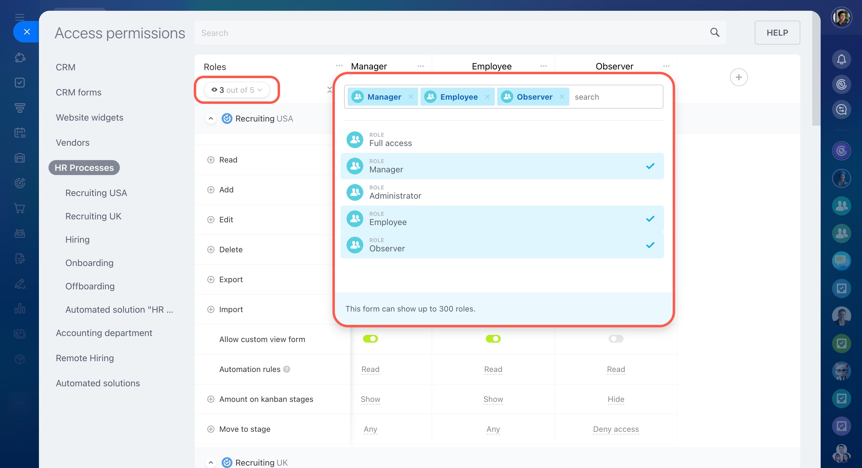 Formulaire CRM : fonctionnalités et paramètres - Règles d'automatisation - possibilité de configurer, modifier ou consulter les règles d'automatisation. Ce droit d'accès apparaît si les règles d'automatisation sont activées dans les paramètres du processus intelligent.