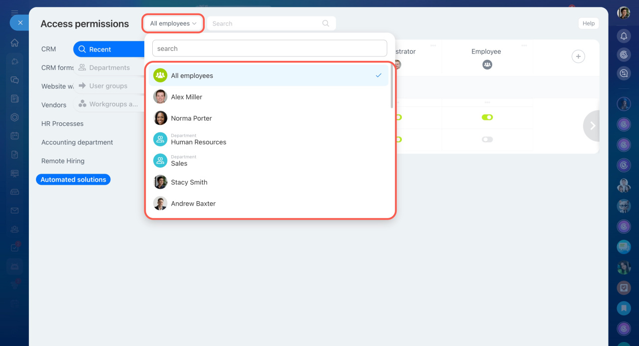 - Dans Bitrix24, des paramètres distincts de droits d'accès aux solutions automatisées ont été introduits. Vous pouvez choisir qui pourra consulter, créer et modifier les éléments des processus intelligents.