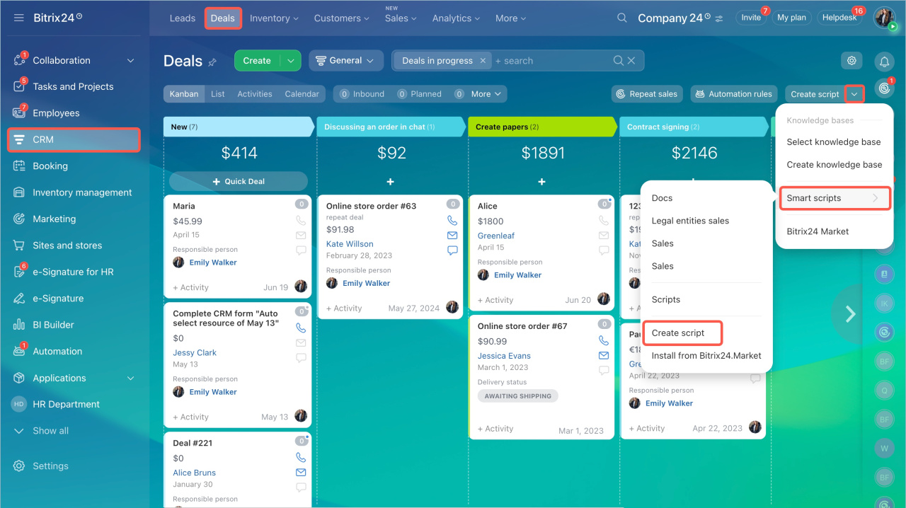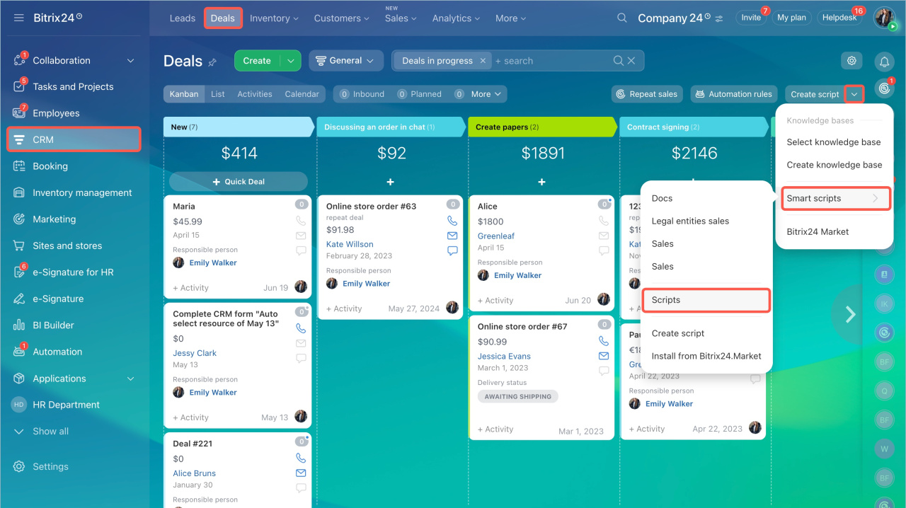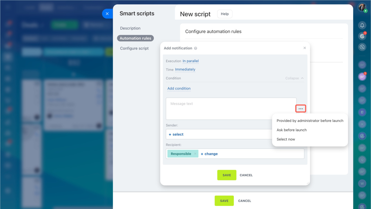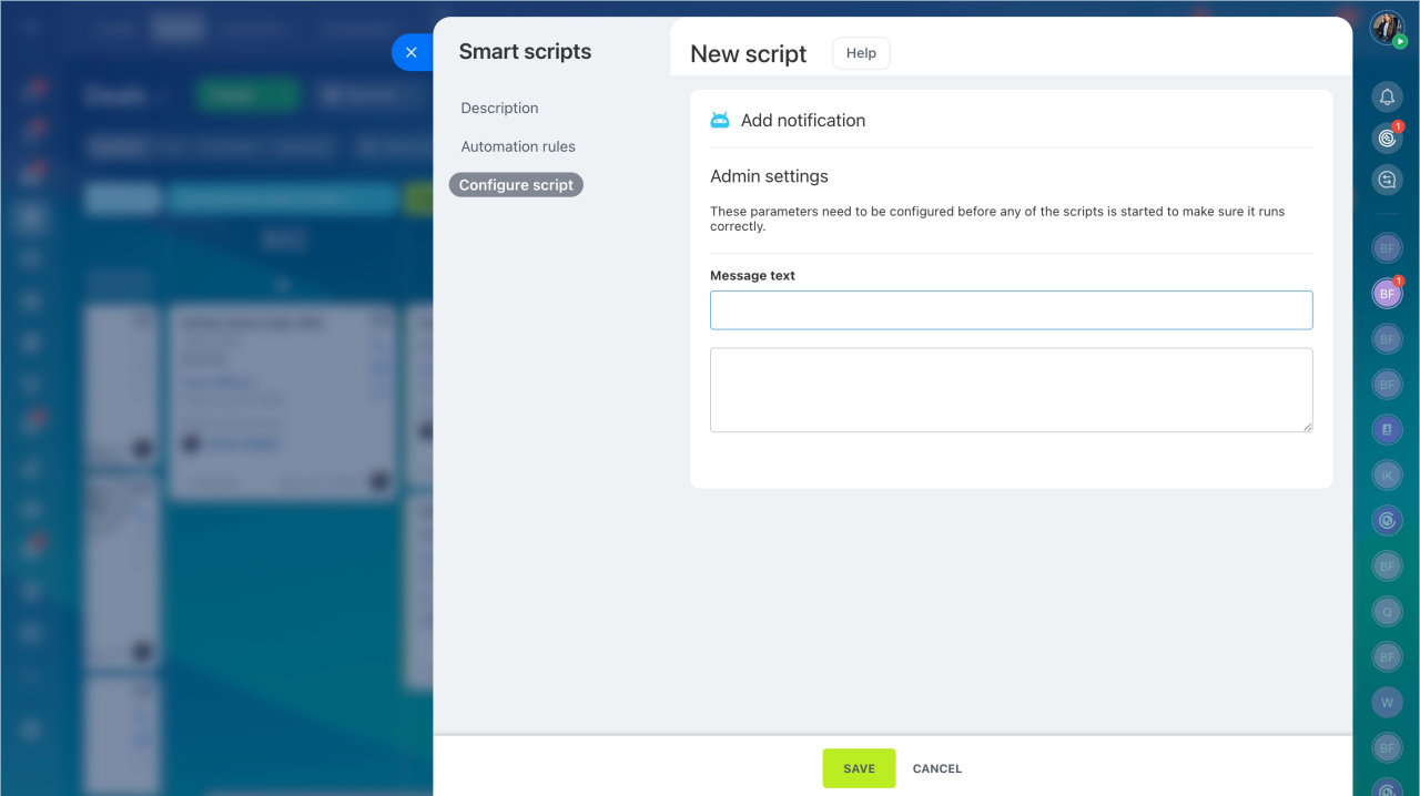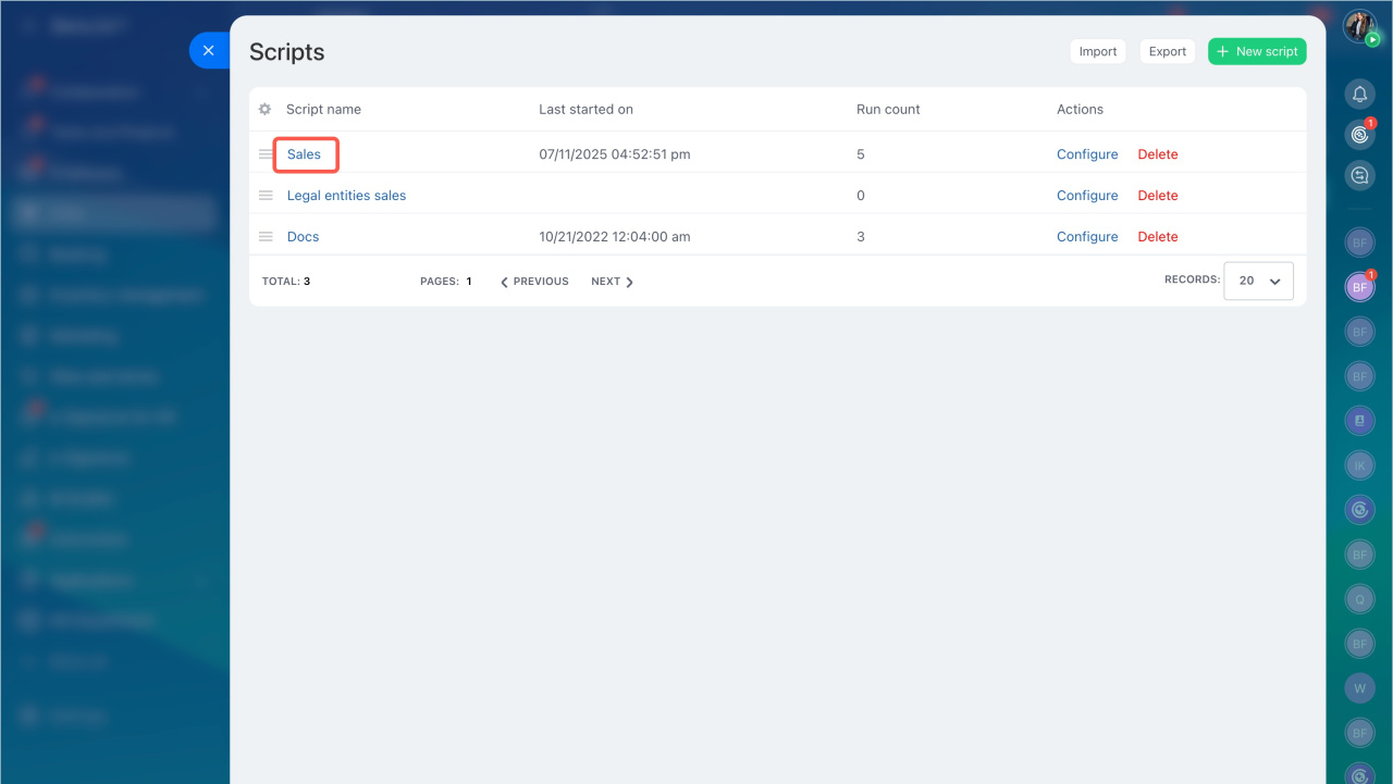 Les administrateurs de Bitrix24 et les employés disposant des droits L'utilisateur peut modifier les préférences peuvent créer et configurer des scripts intelligents.