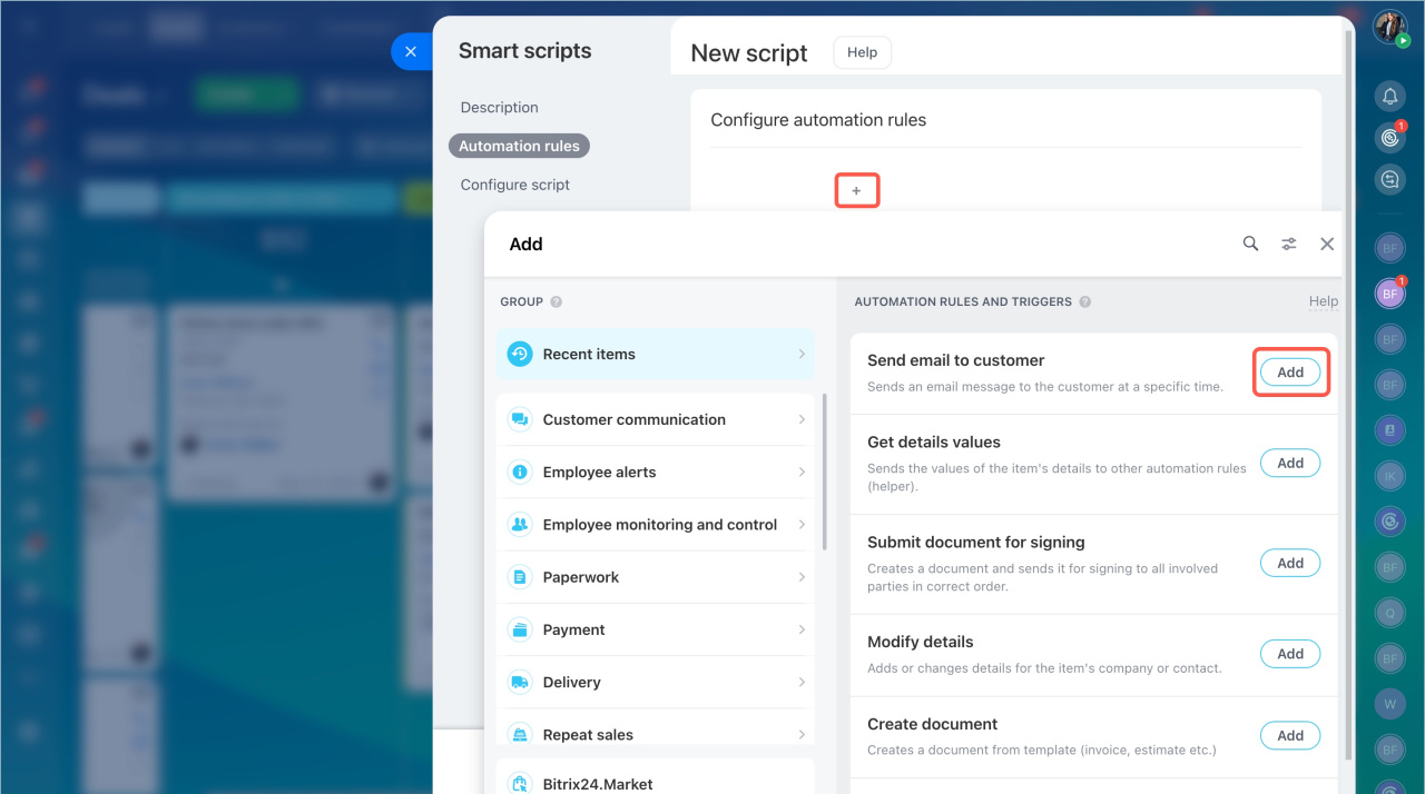 Ajoutez et paramétrez les règles d'automatisation qui exécuteront les actions du script. Par exemple, lorsqu'un employé lance le script, les règles d'automatisation peuvent créer un document associé à la transaction et envoyer une notification.