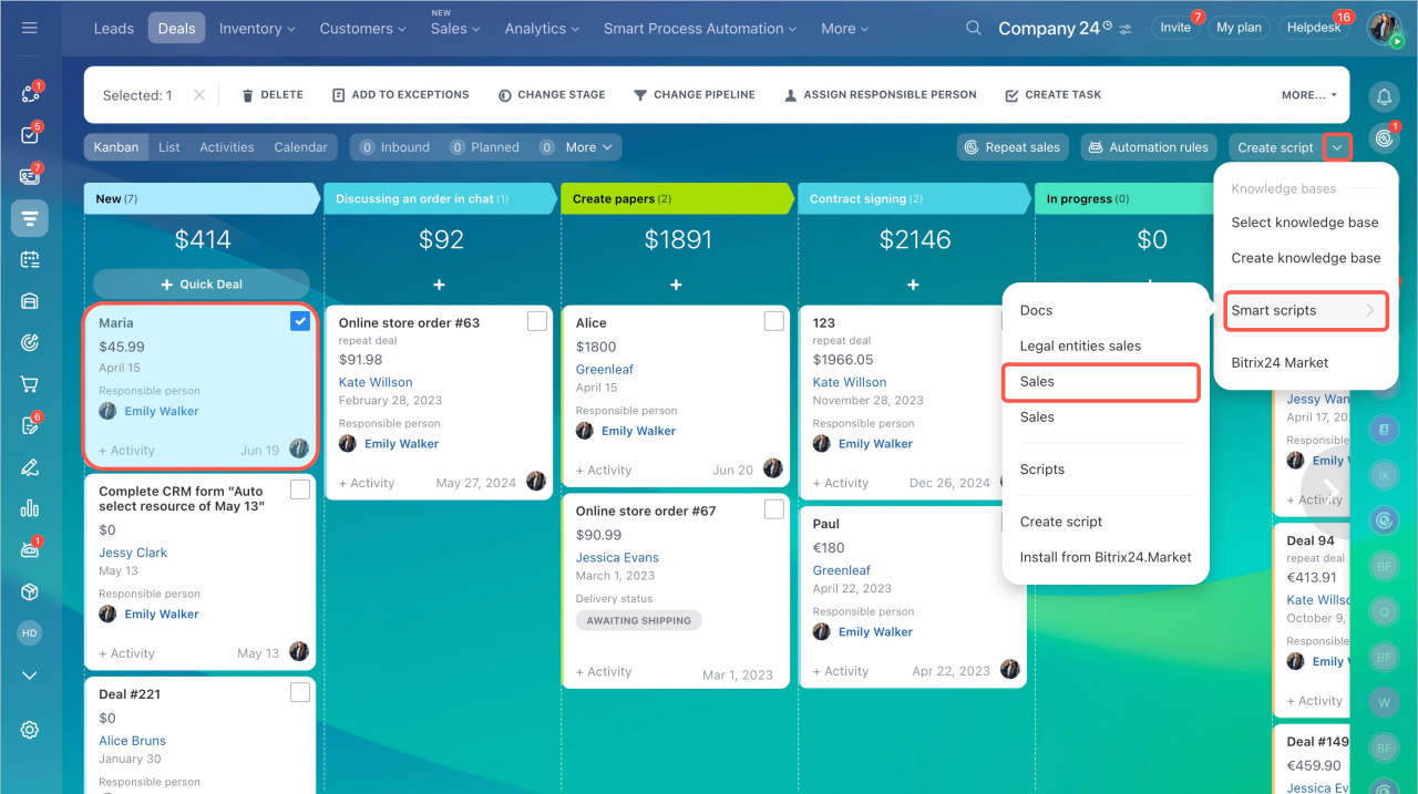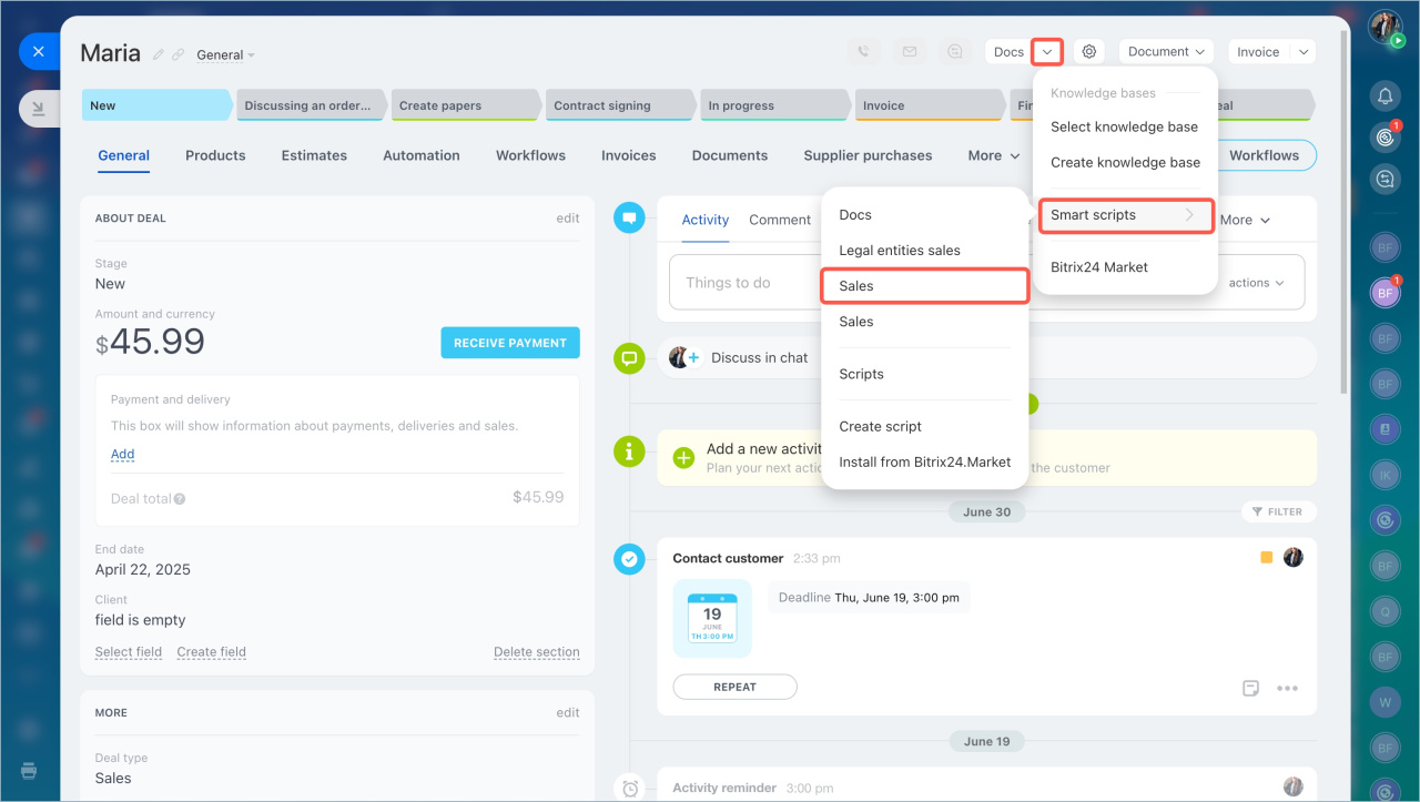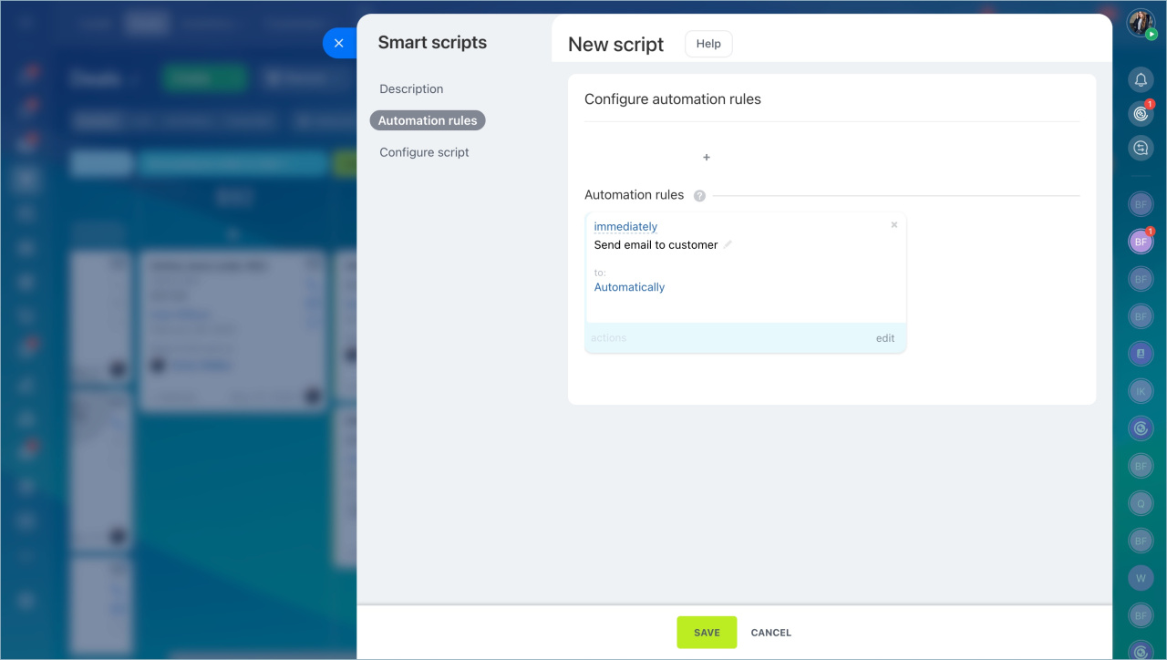 Les scripts intelligents sont des enchaînements de règles d'automatisation configurés qui permettent d'automatiser les tâches répétitives dans le CRM. Ils peuvent être déclenchés manuellement pour n'importe quel élément du CRM, quelle que soit son étape. Par exemple, lorsqu'un client important vous contacte, le script intelligent peut notifier le responsable, planifier un rendez-vous et générer un contrat.