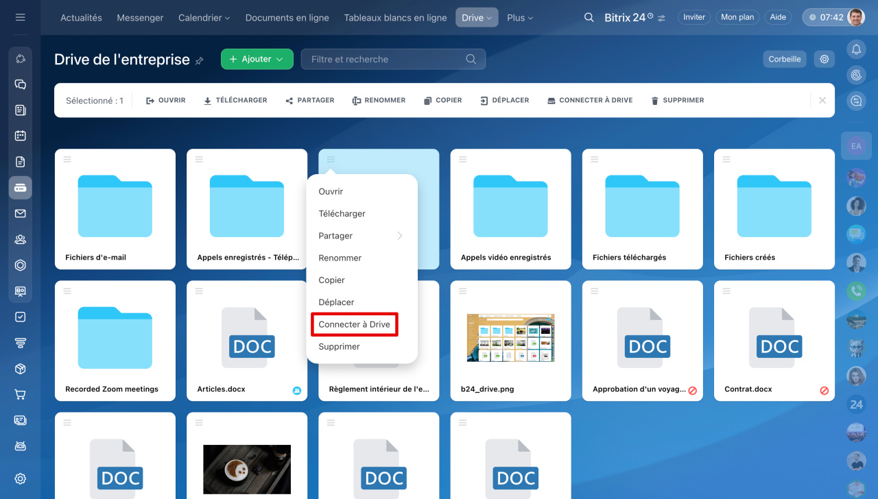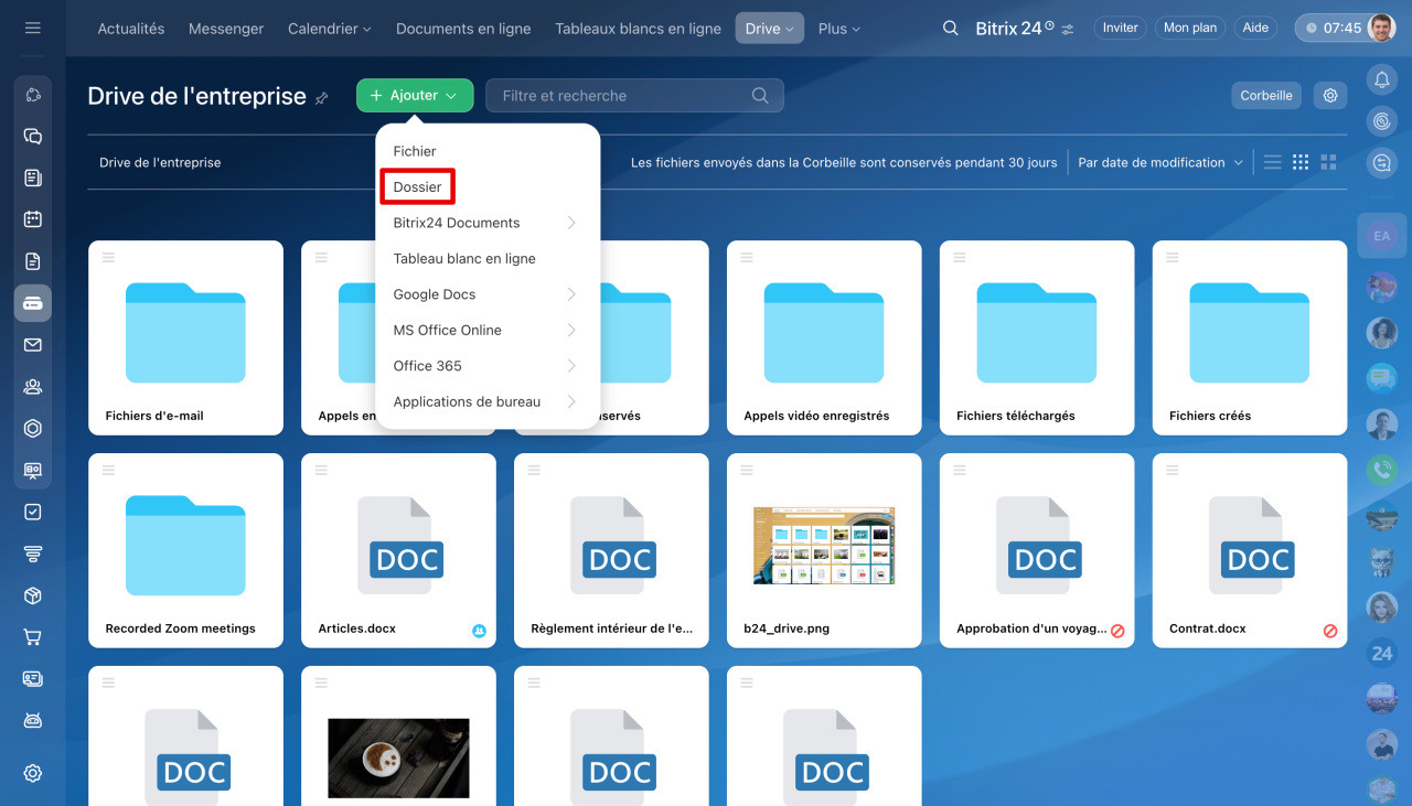 Drive dans Bitrix24 est un outil de gestion des fichiers. Vous pouvez y stocker et modifier des documents d'entreprise, configurer les droits d'accès aux fichiers et synchroniser le Drive avec votre ordinateur. Cet article répond aux questions fréquentes concernant Bitrix24 Drive.