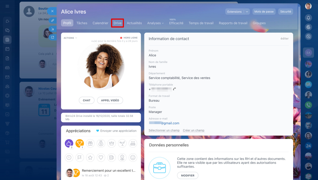 Pour consulter le contenu du Drive, ouvrez le profil du collègue puis sélectionnez Drive.