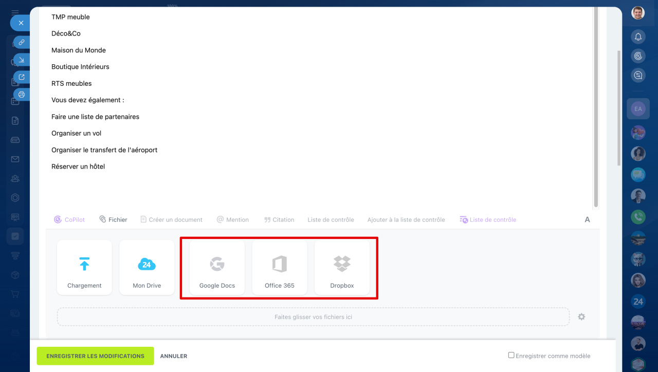 Il n'est pas possible de connecter un stockage cloud externe (comme Dropbox ou Google Drive) directement à Bitrix24. Vous pouvez télécharger manuellement des fichiers depuis ces services cloud. Ils seront stockés dans votre Drive personnel, dans le dossier Fichiers téléchargés.