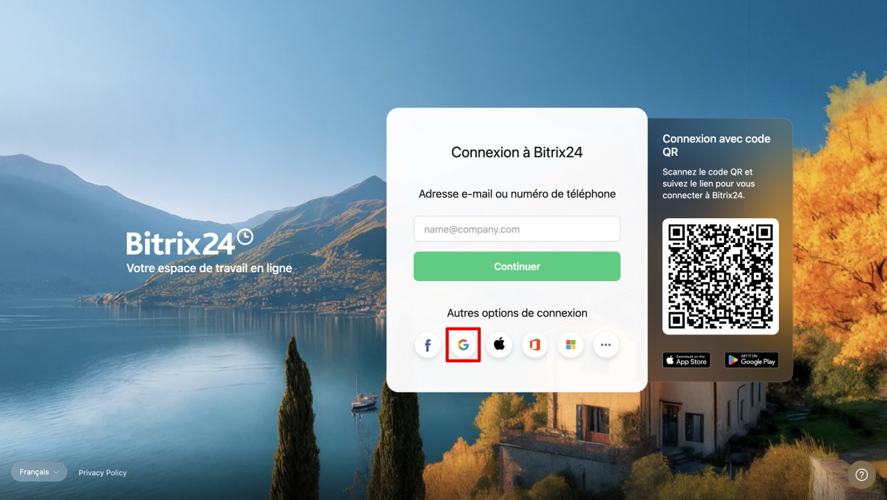 Vous pouvez accéder à Bitrix24 de plusieurs manières : avec un identifiant et un mot de passe, via les réseaux sociaux ou avec un code QR. Si vous utilisez la connexion via les réseaux sociaux, nous vous recommandons de configurer également un accès par identifiant et mot de passe. Ainsi, vous pourrez accéder à votre compte en cas de problème d'authentification via les réseaux sociaux.