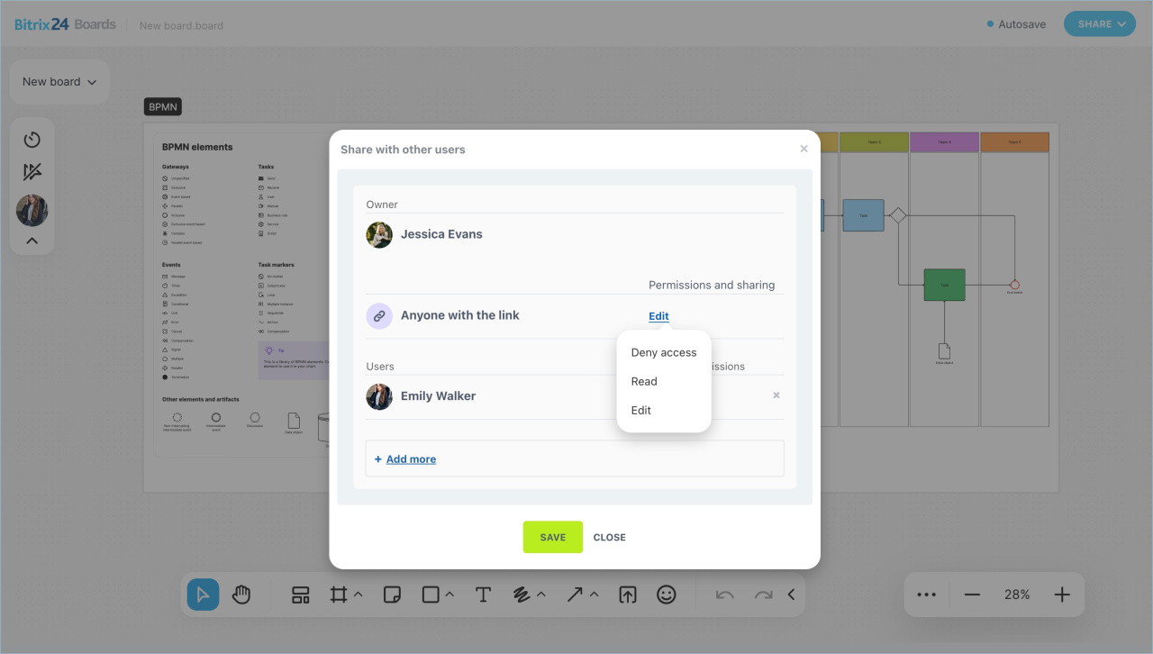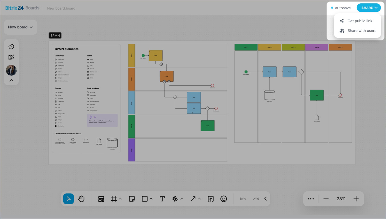 - Intégrez les tableaux blancs en ligne avec d'autres outils Bitrix24 (tâches, discussions, Drive).