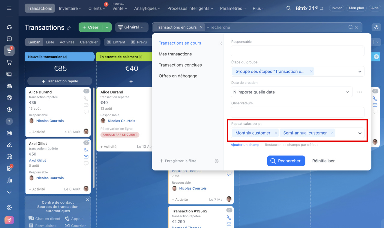 Pour trouver toutes les transactions créées automatiquement via les scénarios de vente répétée, utilisez le filtre Scénario de vente répétée (Repeat sales script).
