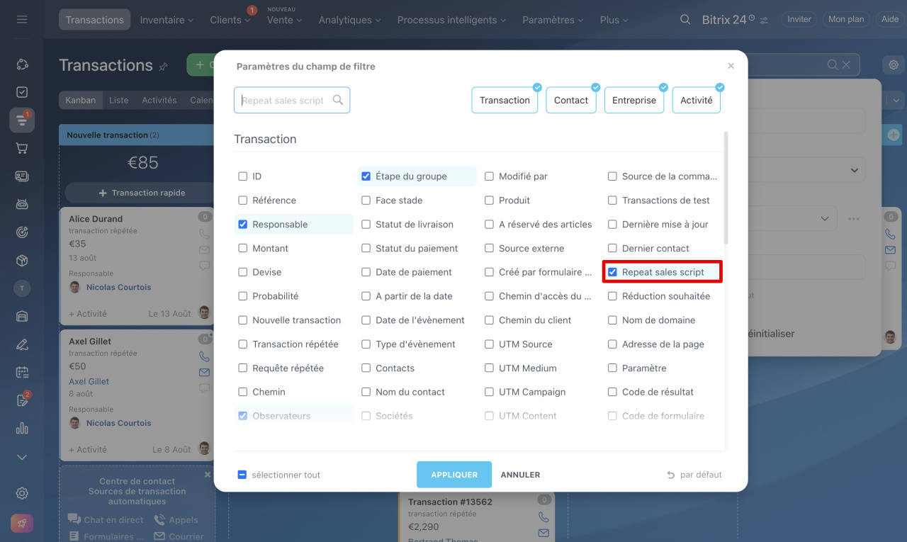 3. Sélectionnez le champ Scénario de vente répétée (Repeat sales script) et cliquez sur Appliquer.