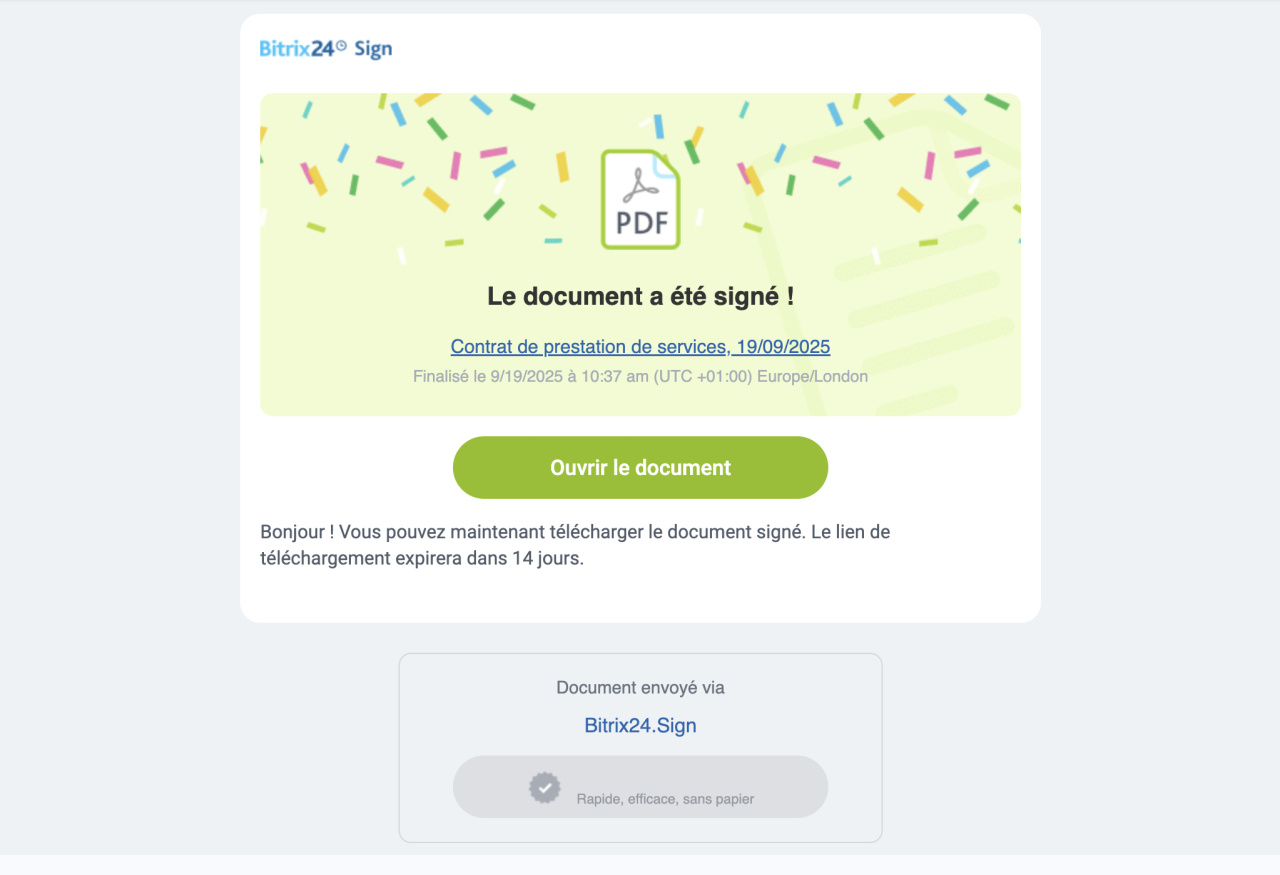 - Après la signature, le document peut être téléchargé. Le lien vers le document signé est valable 14 jours.