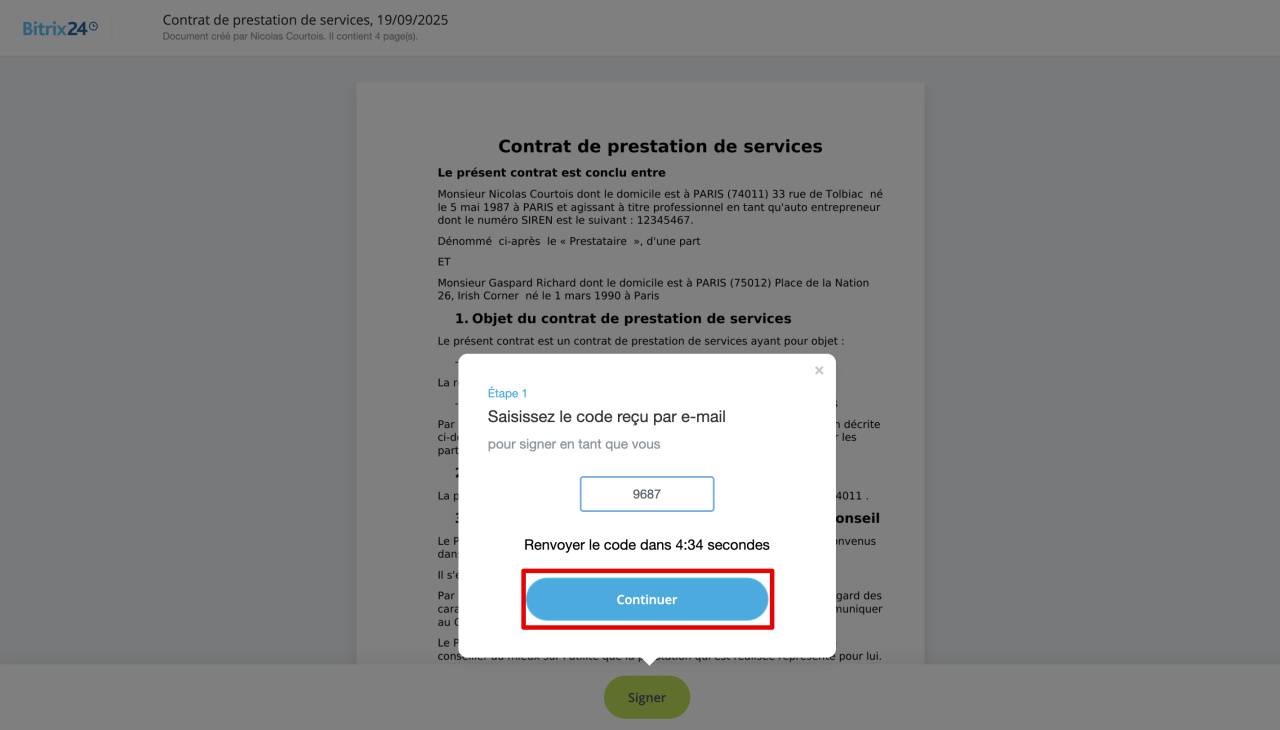 - Consultez les conditions d'utilisation de Bitrix24 Signature électronique et cliquez sur Continuer. Un code vous sera envoyé par e-mail.