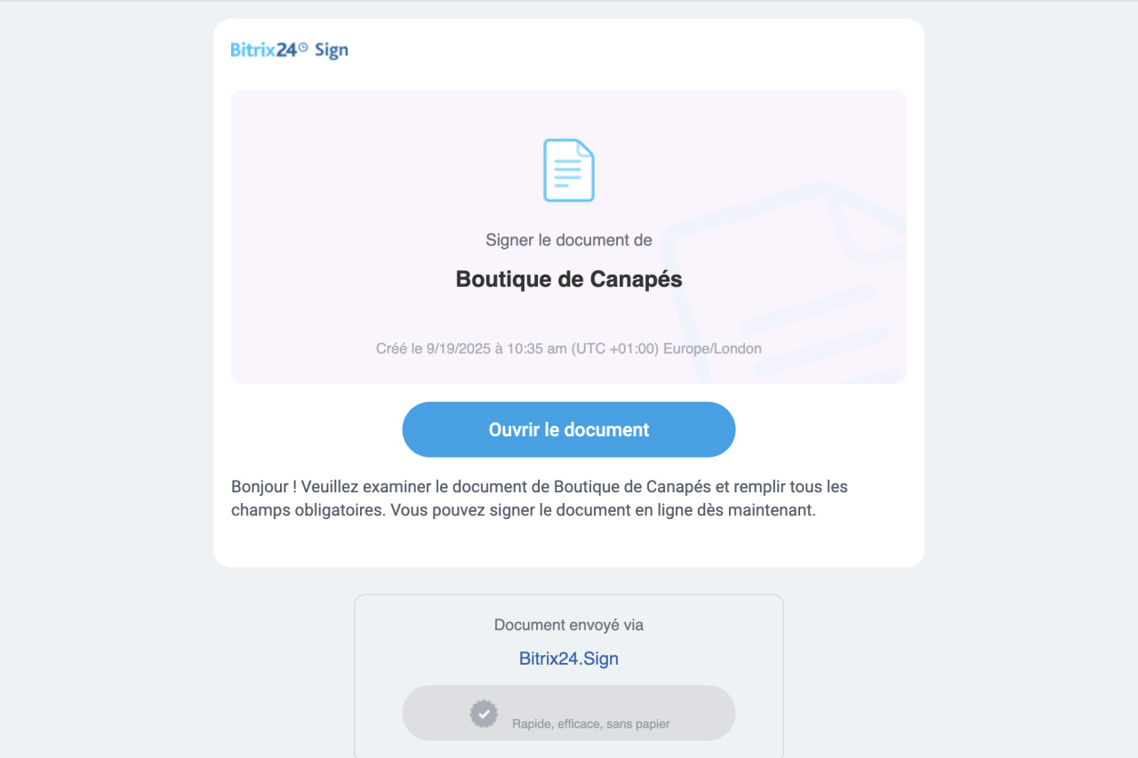 - Une fois que le signataire de l'entreprise émettrice a signé le document, le client reçoit un lien par e-mail ou SMS. Le canal d'envoi est choisi lors de l'envoi du document pour signature.