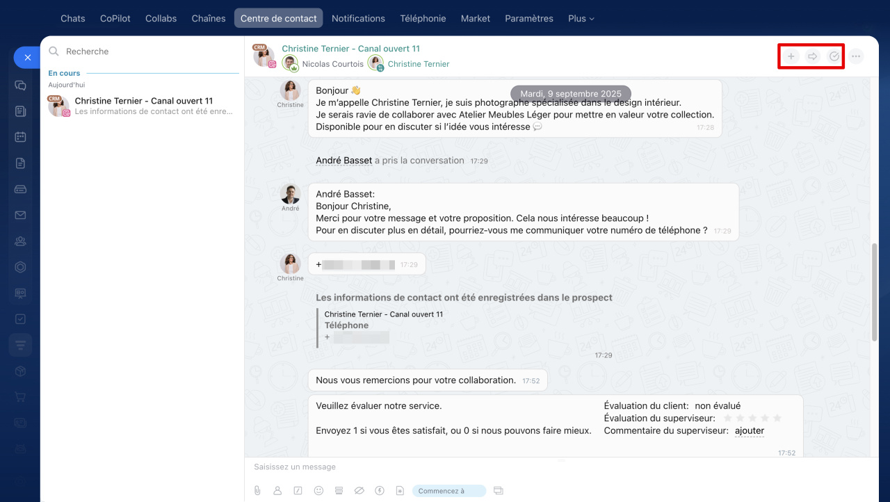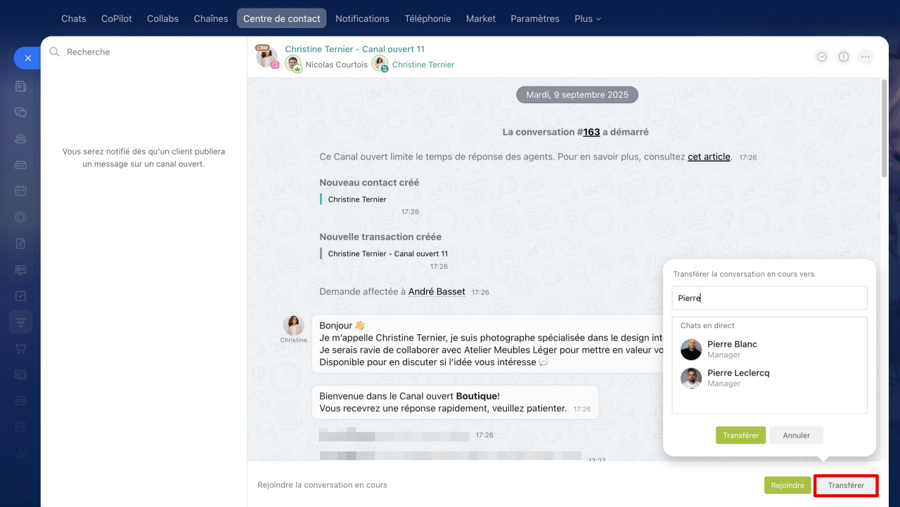 Le dialogue est déjà pris en charge. Cliquez sur le bouton approprié pour transférer la conversation à un autre employé ou à un autre canal ouvert.