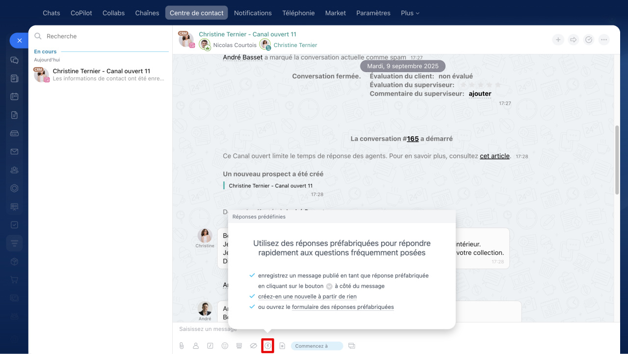 - Ouvrez un chat dans Centre de contact et cliquez sur l'icône pour accéder à la base de réponses prêtes.