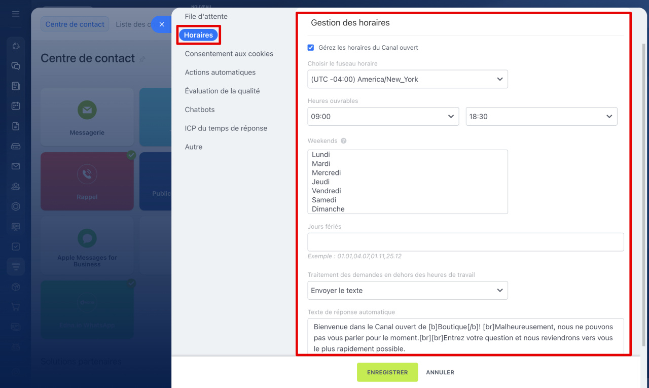 Configurez une réponse automatique pour les messages reçus en dehors des heures de travail. Les clients pourront envoyer un message, mais recevront une notification indiquant qu'une réponse leur sera apportée pendant les heures de travail.