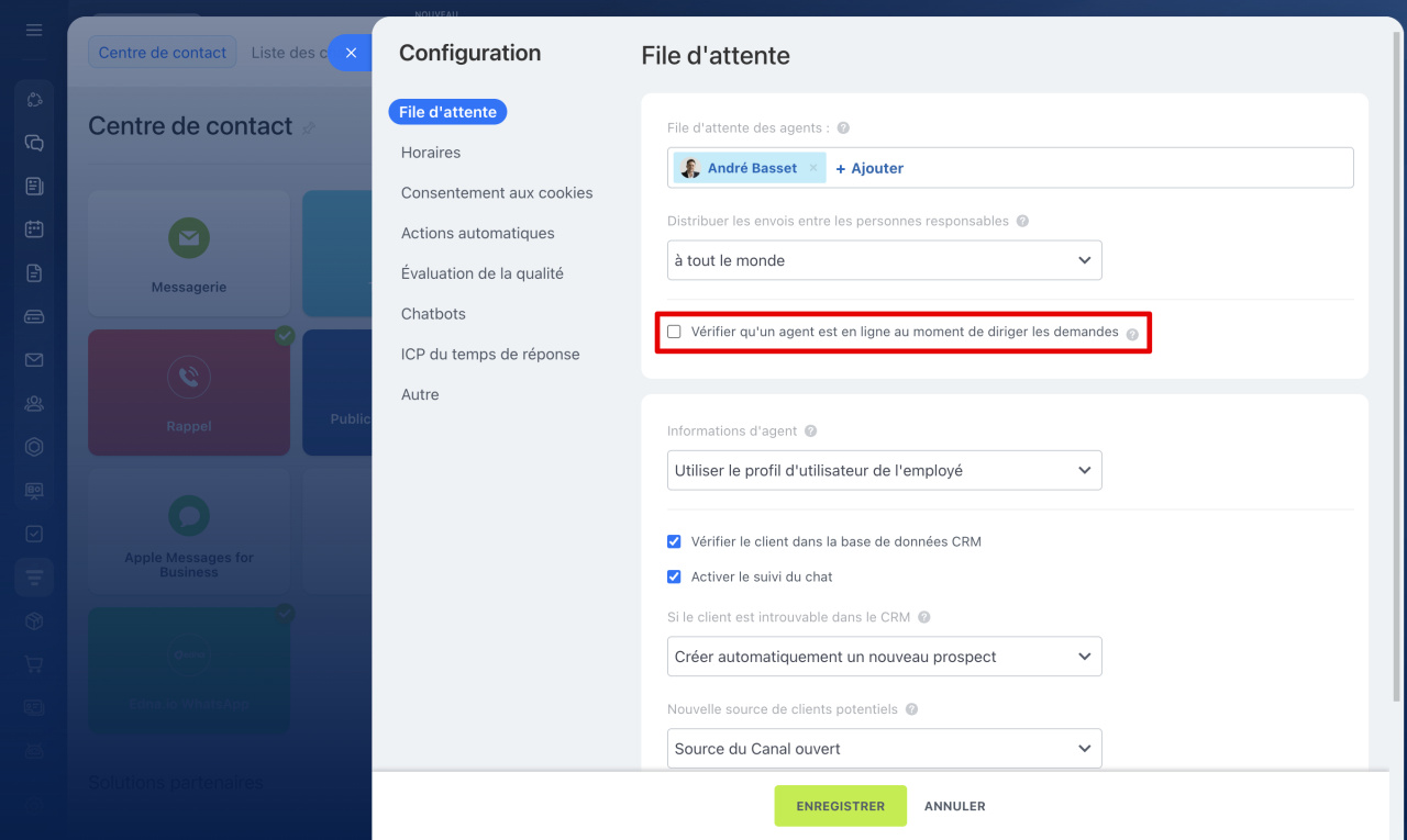 Dans les paramètres du canal ouvert, activez l'option Vérifier qu'un agent est en ligne au moment de diriger les demandes. Ainsi, les nouveaux dialogues ne seront pas attribués aux employés qui sont hors ligne ou absents, par exemple en pause déjeuner ou en congé.