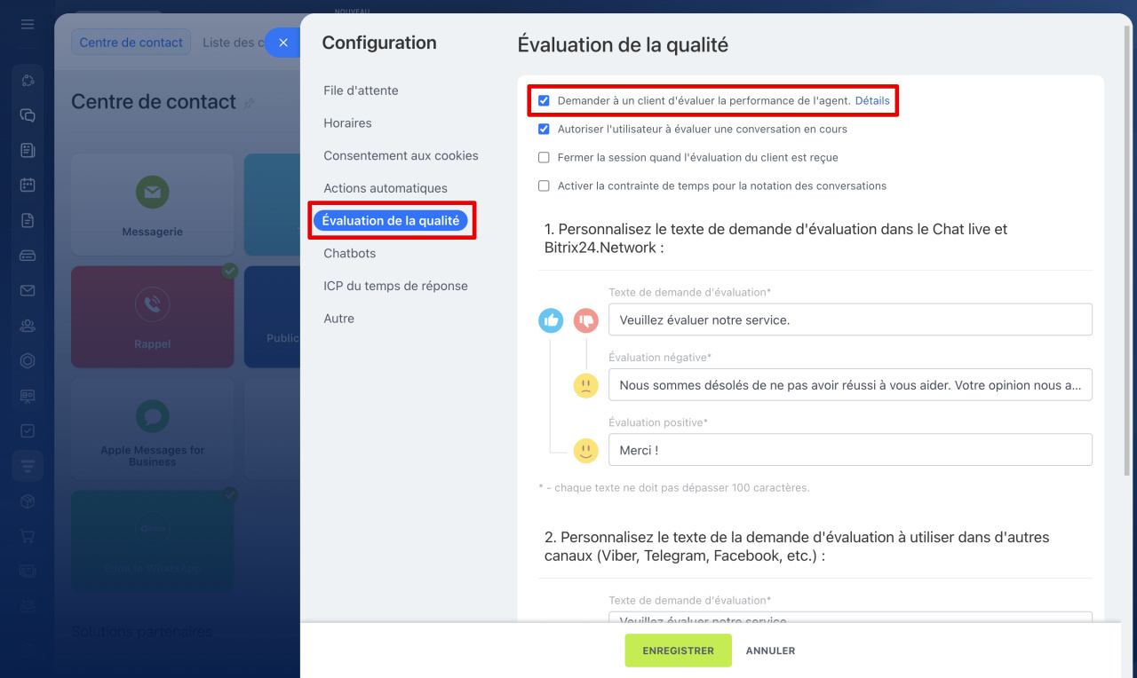 Pour permettre aux clients d'évaluer la qualité du service, accédez à l'onglet Évaluation de la qualité dans les paramètres du canal ouvert et activez l'option Demander à un client d'évaluer la performance de l'agent.