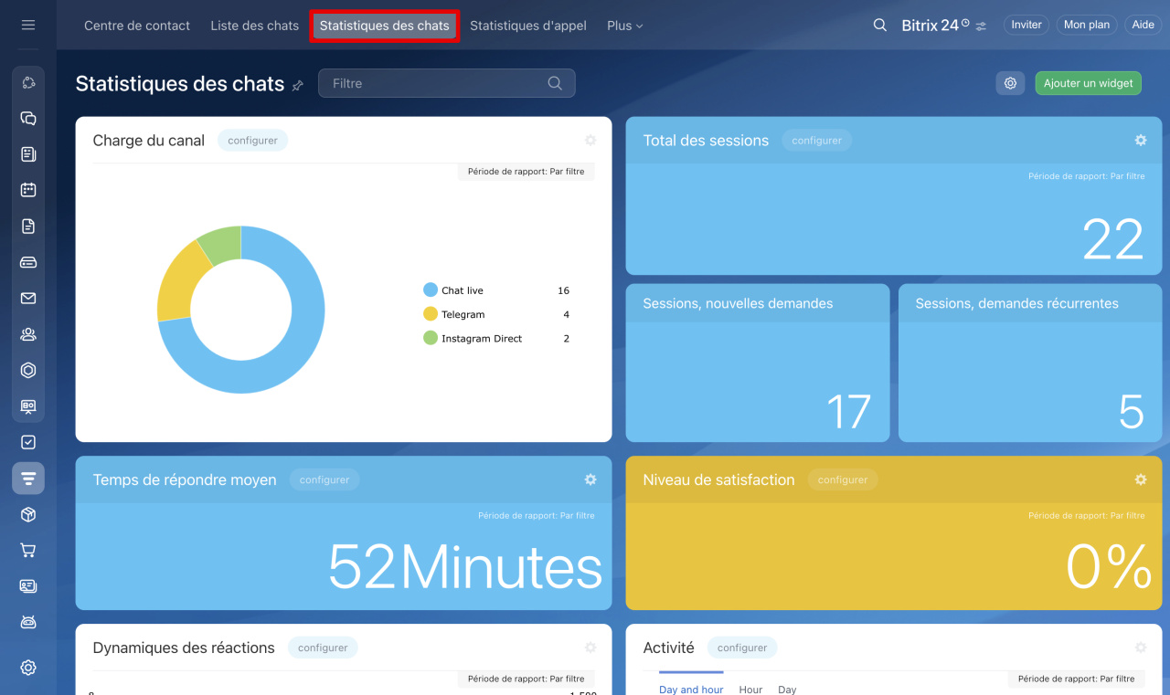 Accédez à la section CRM - Clients - Centre de contact - Statistiques des chats.