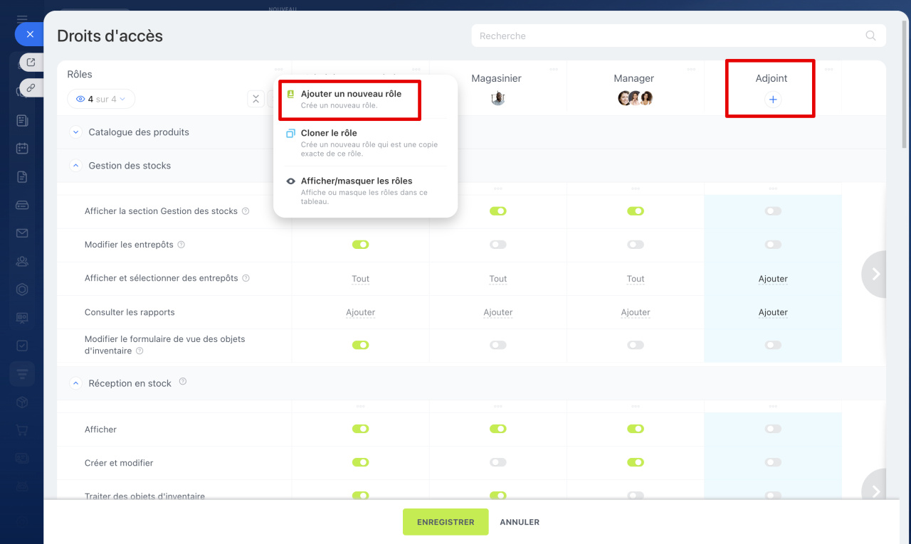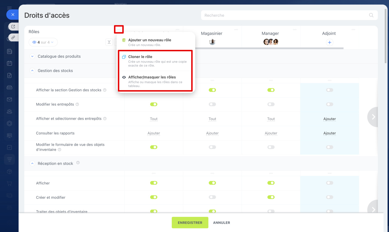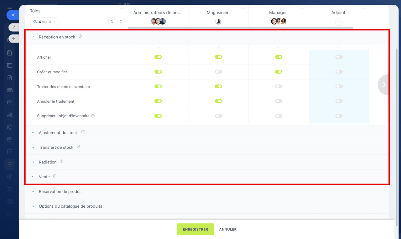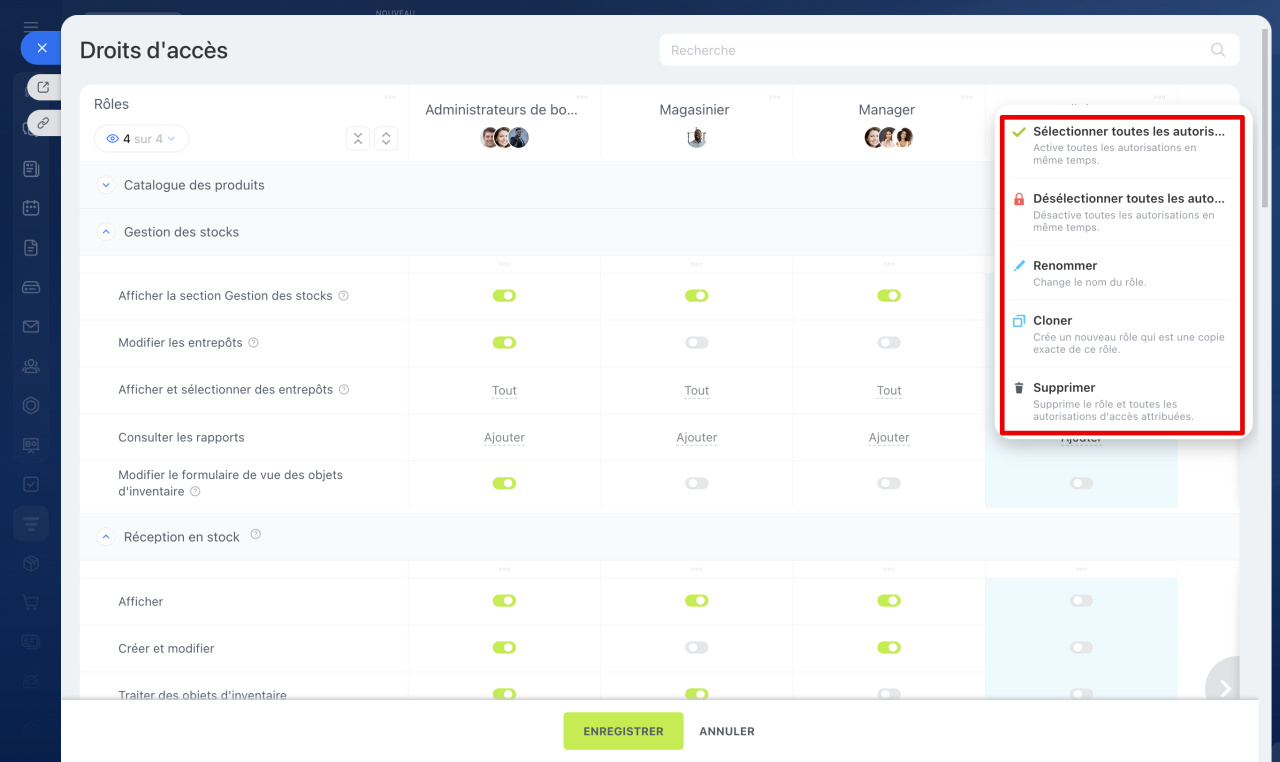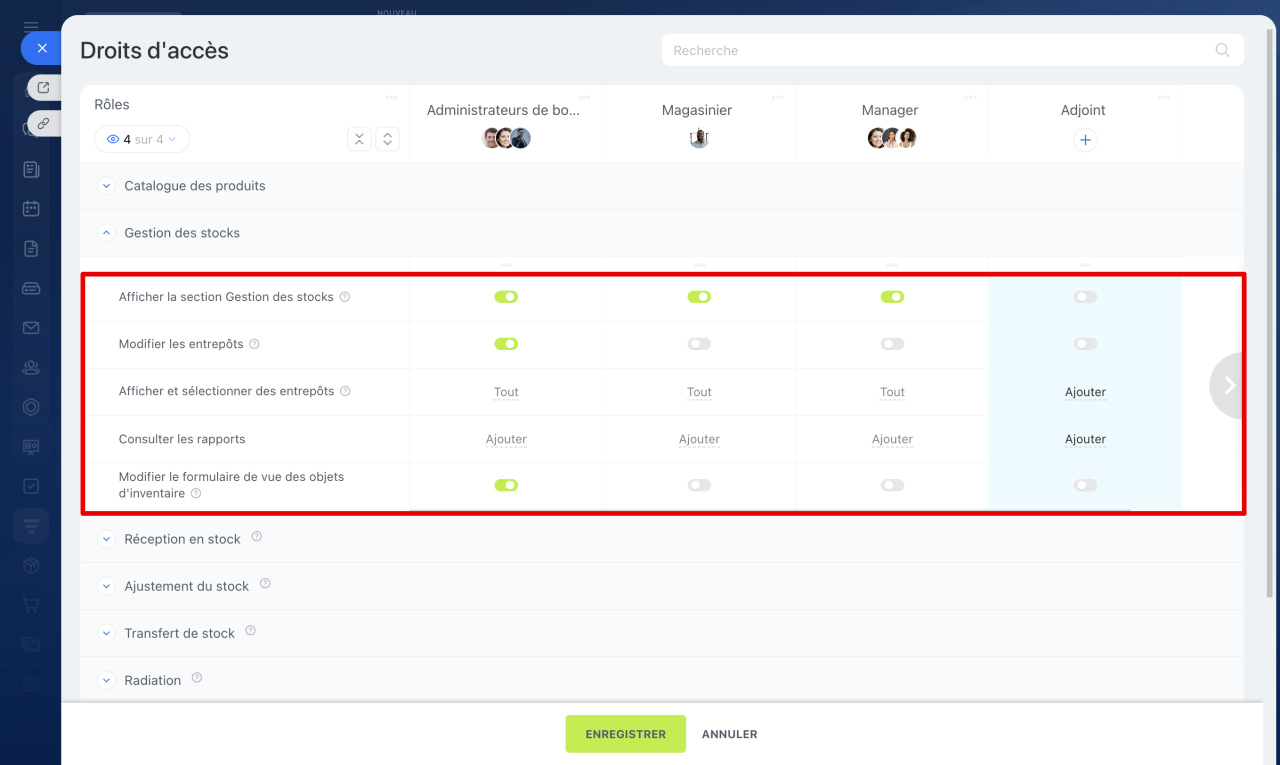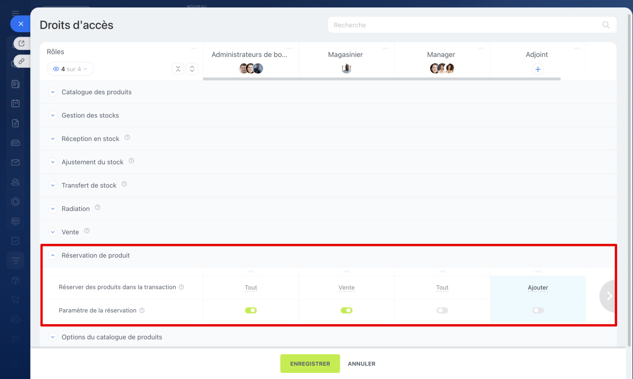 - Les droits d'accès sont divisés en trois blocs : gestion des stocks, documents de gestion des stocks et réservation de produit.