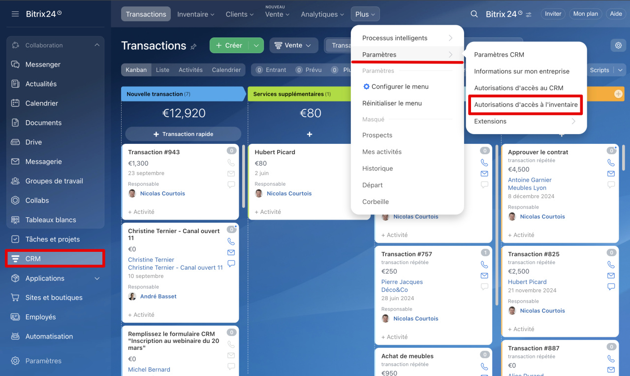Par défaut, seul l'administrateur Bitrix24 peut configurer les droits d'accès, mais il peut déléguer cette tâche à d'autres employés. Pour configurer les droits, accédez à la section CRM - Plus - Paramètres - Autorisations d'accès à l'inventaire.