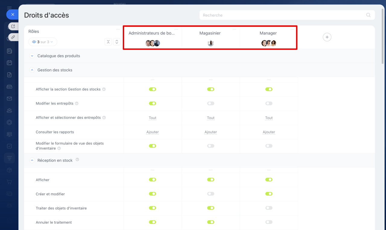 Les droits d'accès à la gestion des stocks sont divisés en trois blocs.