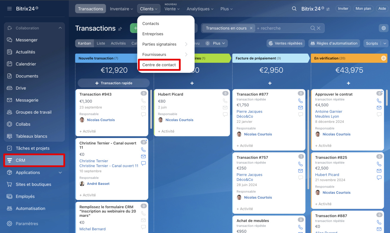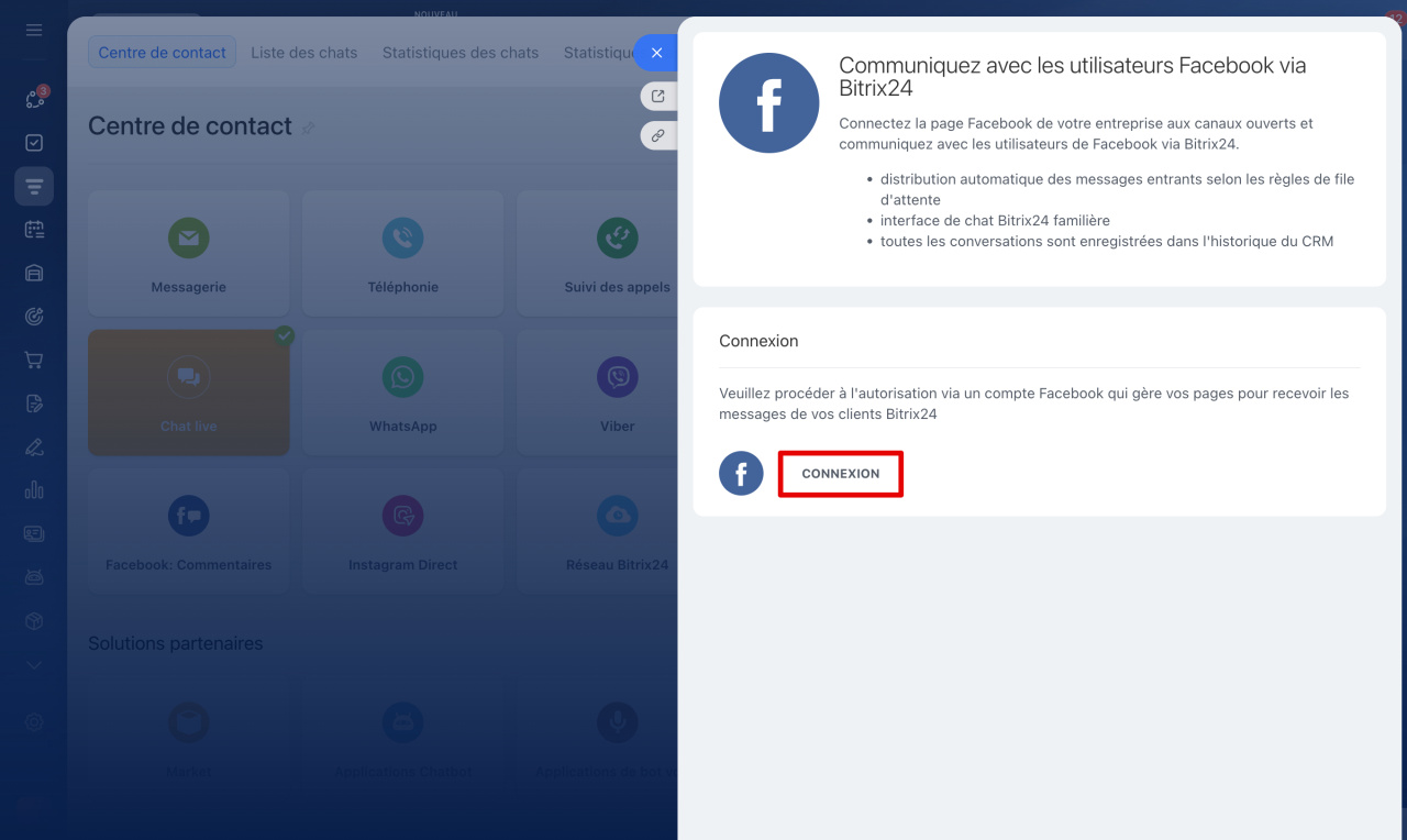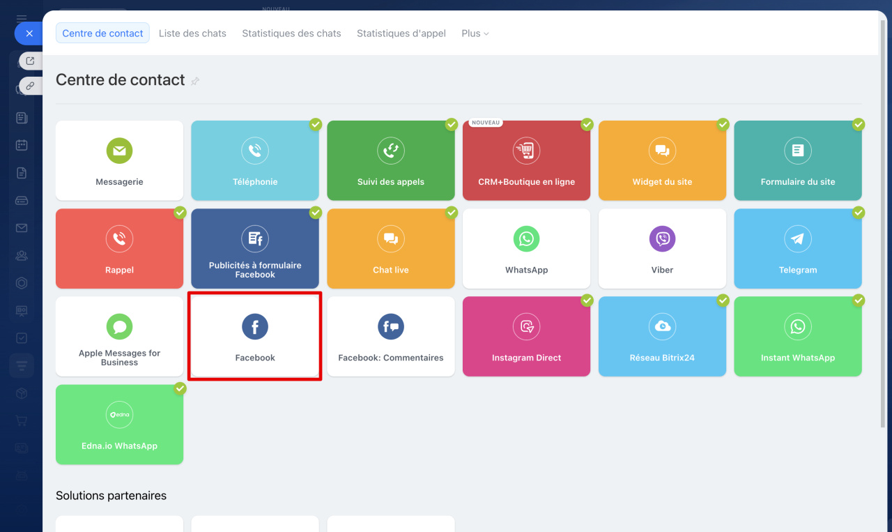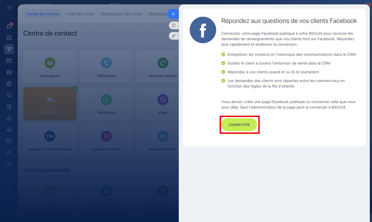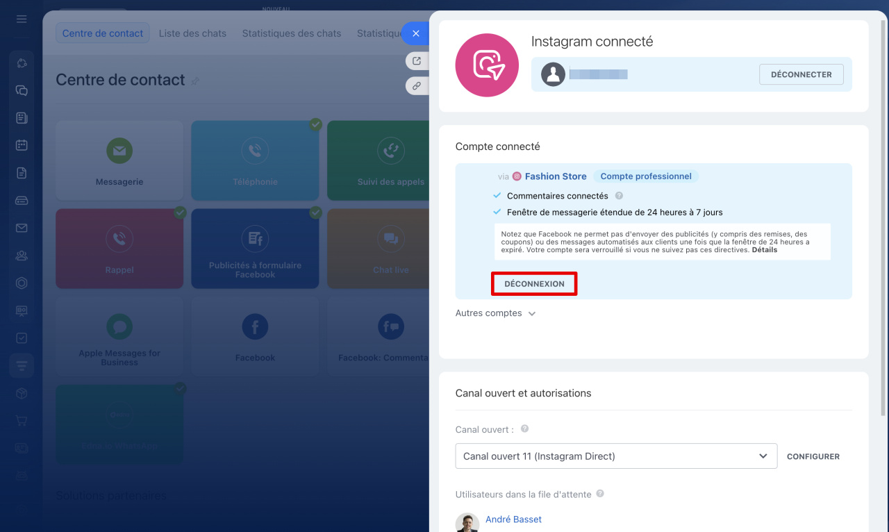 1. Rendez-vous dans CRM - Clients - Centre de contact - Facebook ou Instagram Direct.