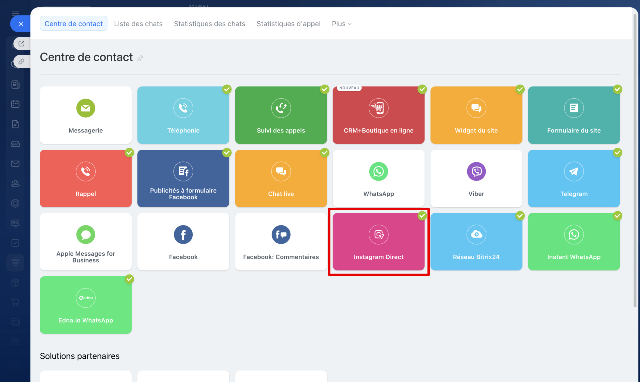 1. Ouvrez CRM - Clients - Centre de contact - Facebook ou Instagram Direct.