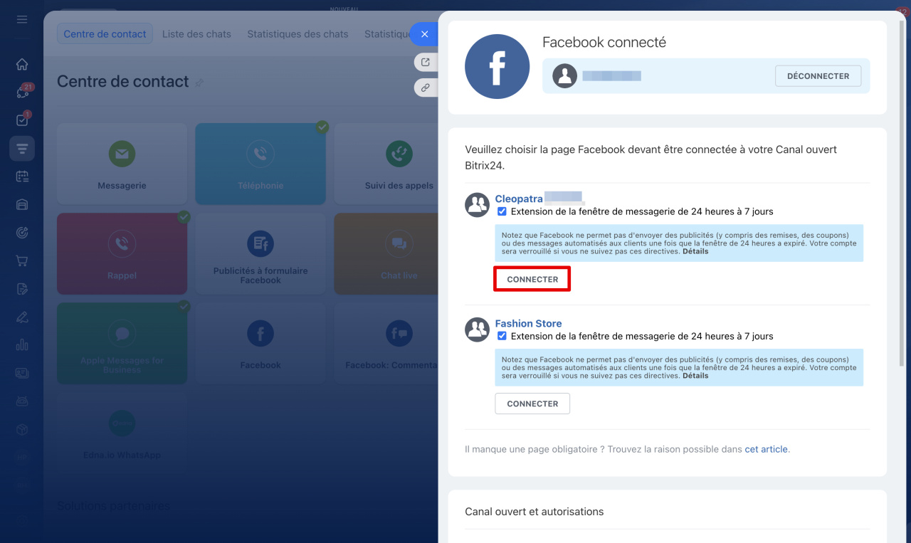 - Pour un canal déjà connecté, vous pouvez modifier ce paramètre en dissociant puis en reconnectant la page Facebook ou le compte Instagram.