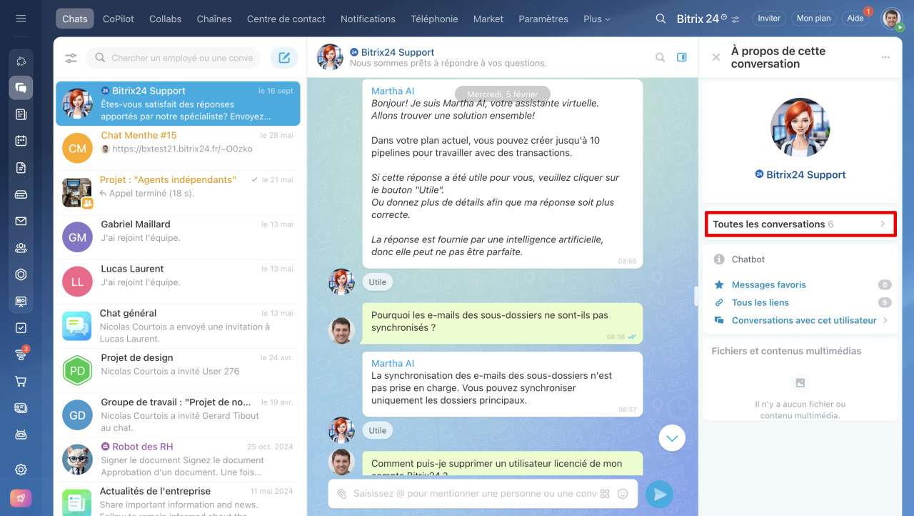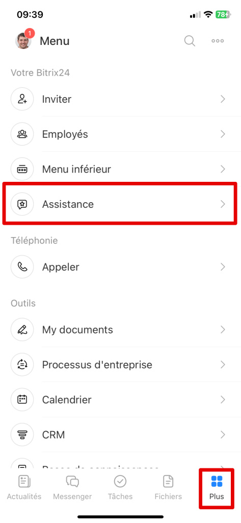 Vous pouvez contacter le chat d'assistance depuis l'application web ou mobile de Bitrix24.