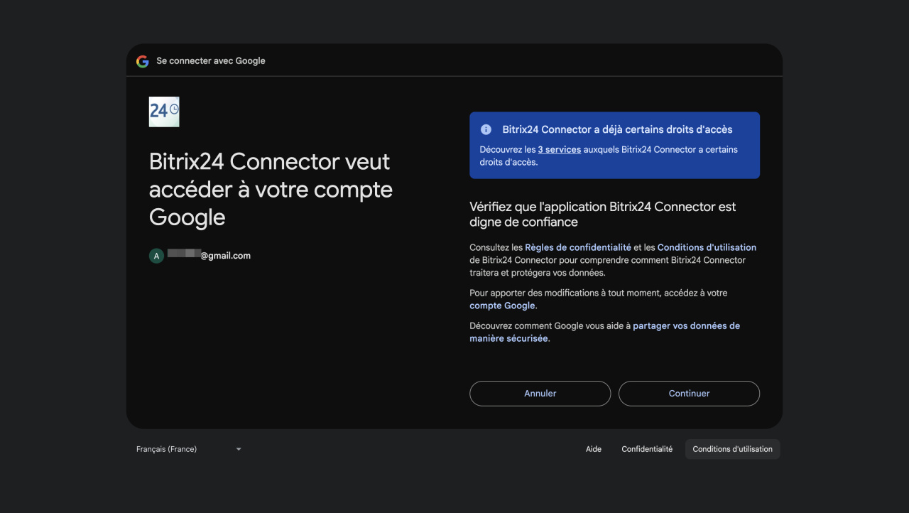 7. Autorisez l'application Bitrix24 Connector à accéder à votre compte en cliquant sur Continuer.
