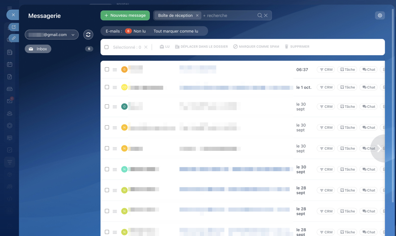 Vous pouvez connecter des boîtes de réception Gmail, Outlook et d'autres services à Bitrix24. Une fois connectées, les e-mails seront directement acheminés vers Bitrix24. Vous pourrez y répondre, associer les conversations à des tâches, en discuter avec vos collègues dans le chat ou encore créer des prospects et des transactions dans le CRM à partir des messages.