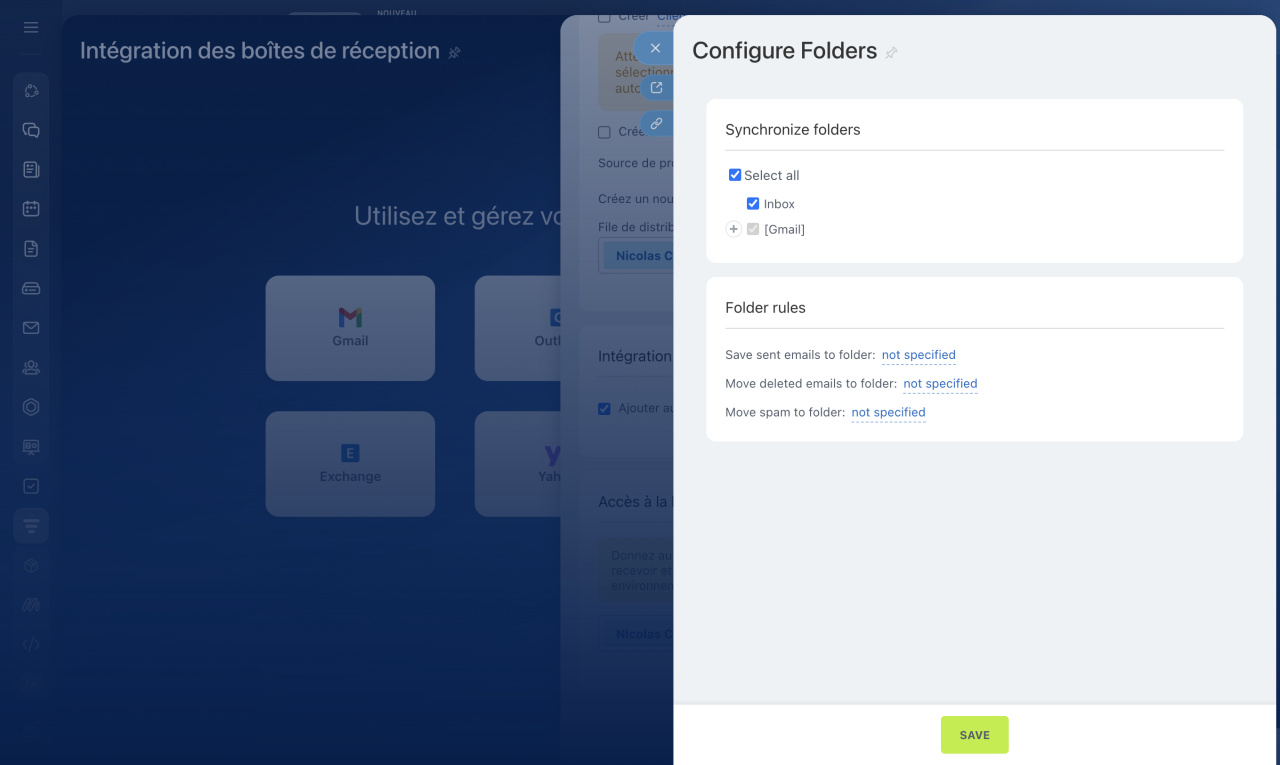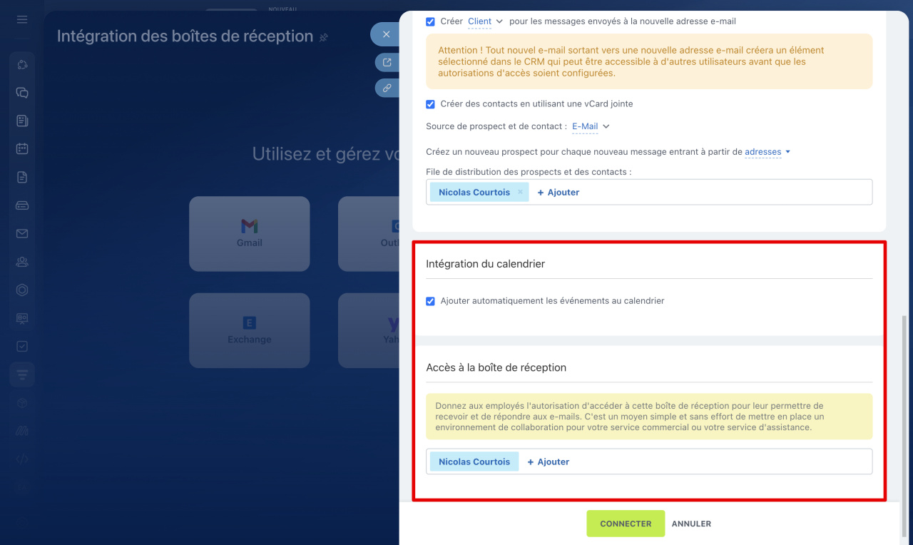- Configurez la boîte de réception : activez l'intégration avec le CRM et l'agenda, indiquez les collaborateurs qui utiliseront cette boîte de réception, etc.